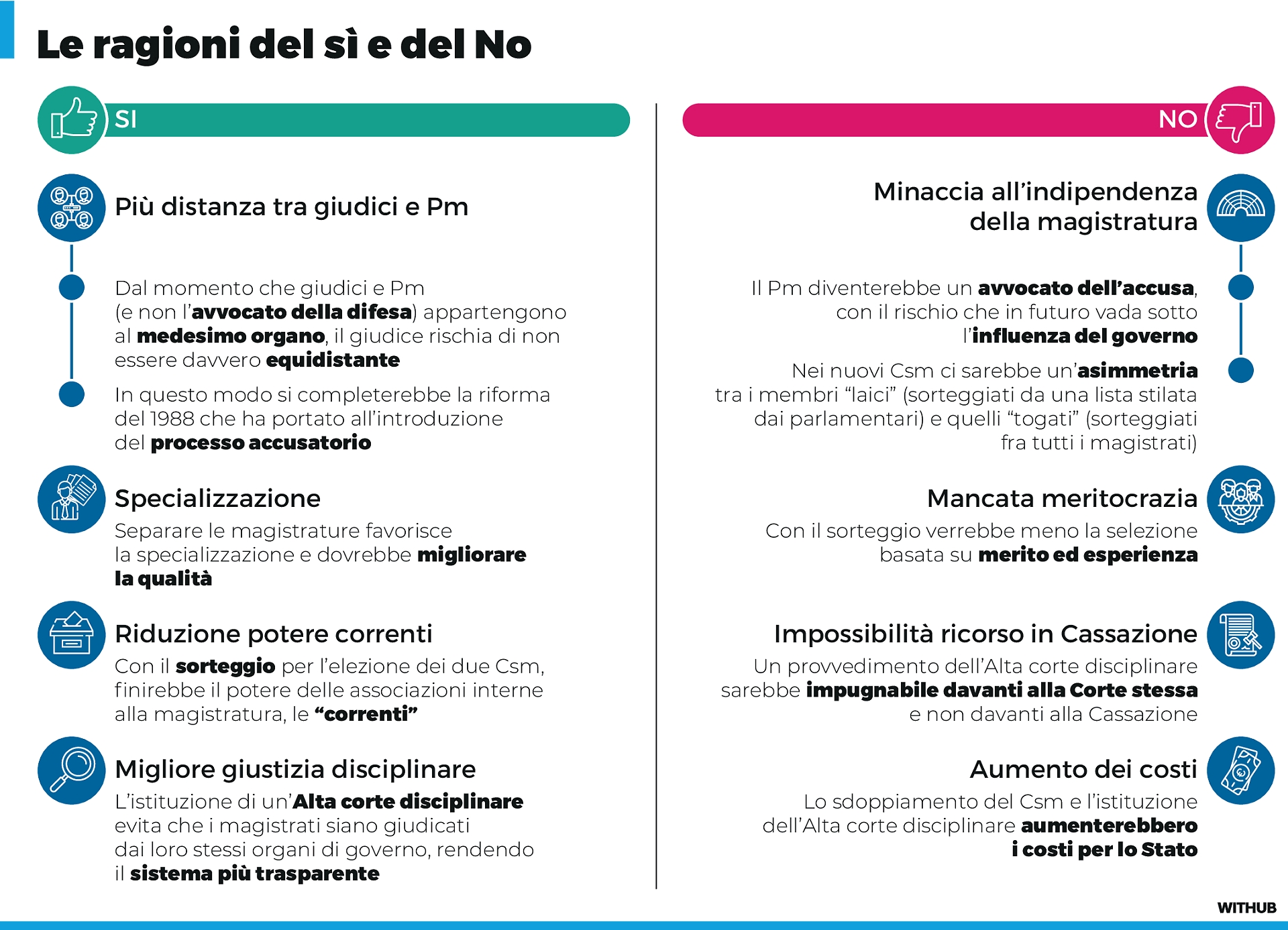 - Per i contrari, il rischio è una magistratura frammentata e più vulnerabile; la separazione non aumenterebbe davvero l’imparzialità dei giudici, già garantita dalle regole vigenti, e potrebbe erodere l’autonomia del pm, specie se gli organi di autogoverno perdessero massa critica. La nuova Alta Corte sarebbe troppo sensibile agli equilibri di nomina e alla politica. Le principali correnti della magistratura e studi dell’Anm hanno espresso in queste settimane un no argomentato.