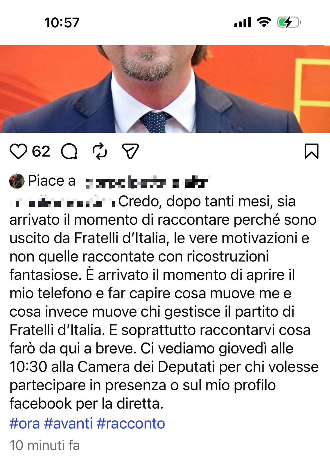 Il passaggio più scottante è la minaccia di rendere pubbliche conversazioni e materiali riservati: “È arrivato il momento di aprire il mio telefono e far capire cosa muove me e cosa invece muove chi gestisce il partito di Fratelli d'Italia”.