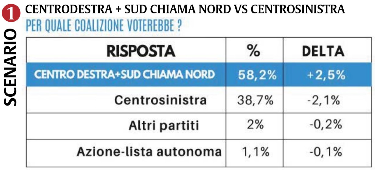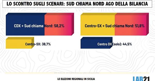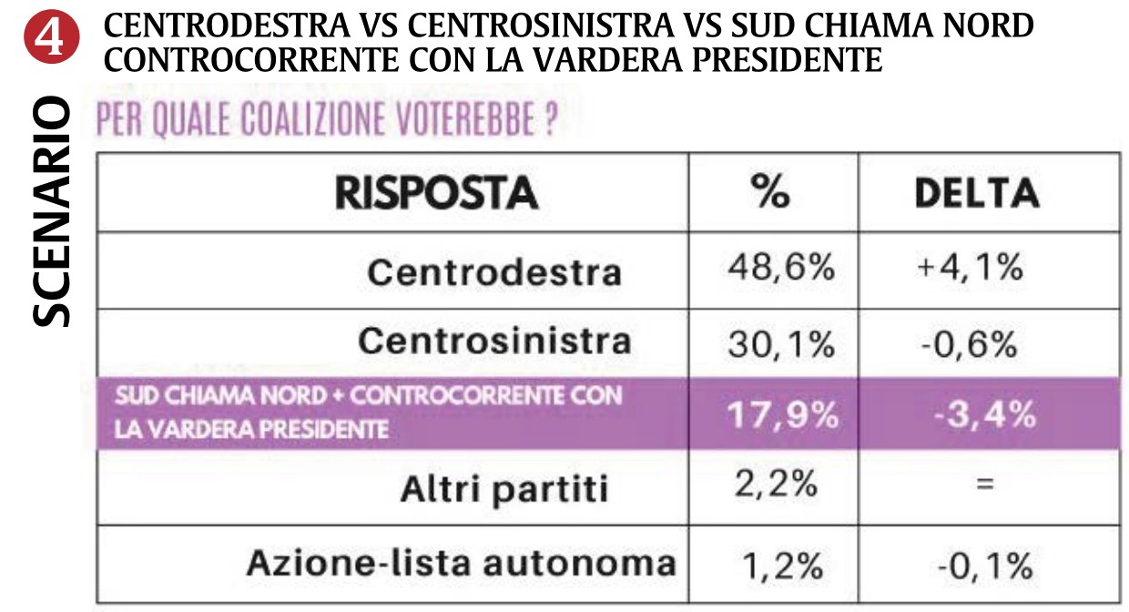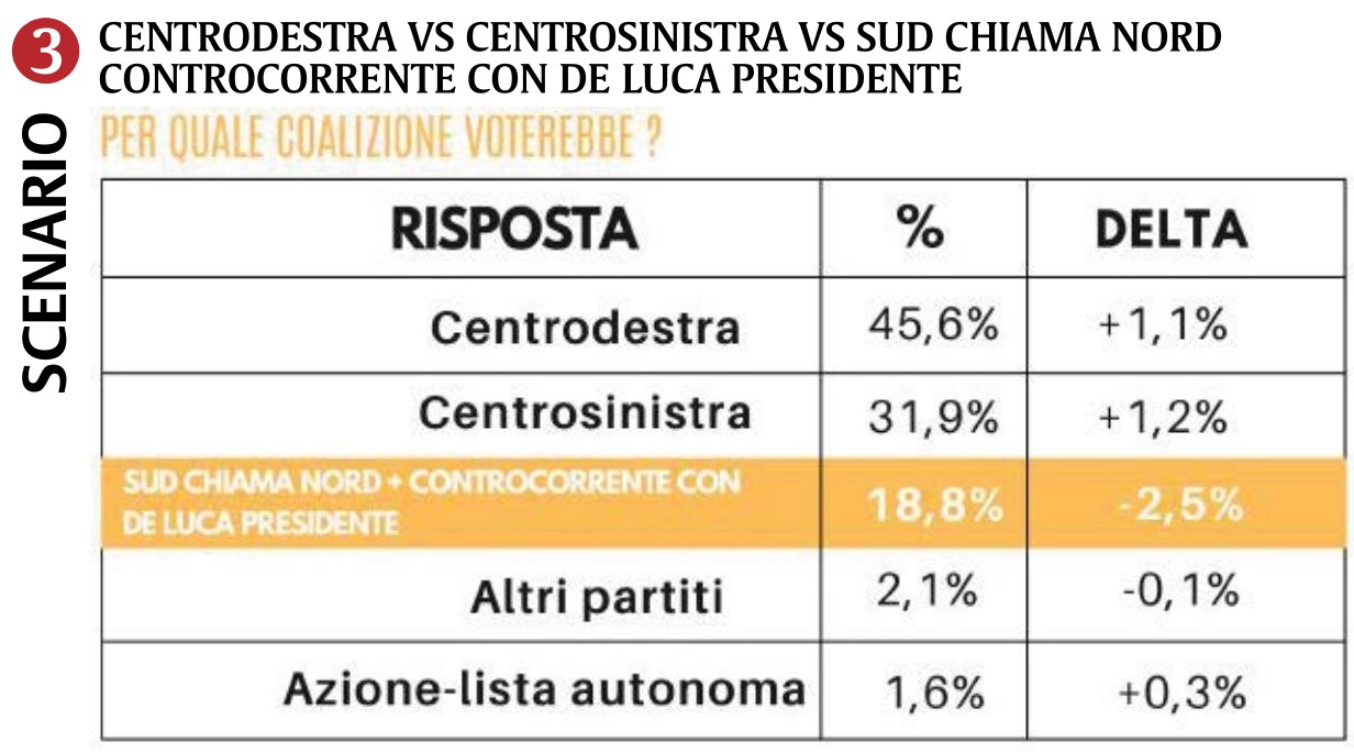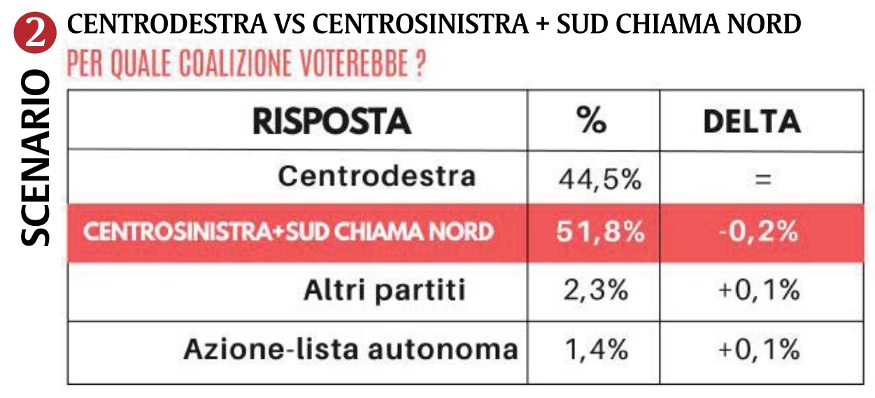 Il sondaggio, però, non prende in considerazione la corsa solitaria, così come nel 2022, del leader di Sud chiama Nord. Manca dunque il peso specifico di "Scateno" (primo dei perdenti alle ultime Regionali, con quasi il 24%) contro i due schieramenti tradizionali.