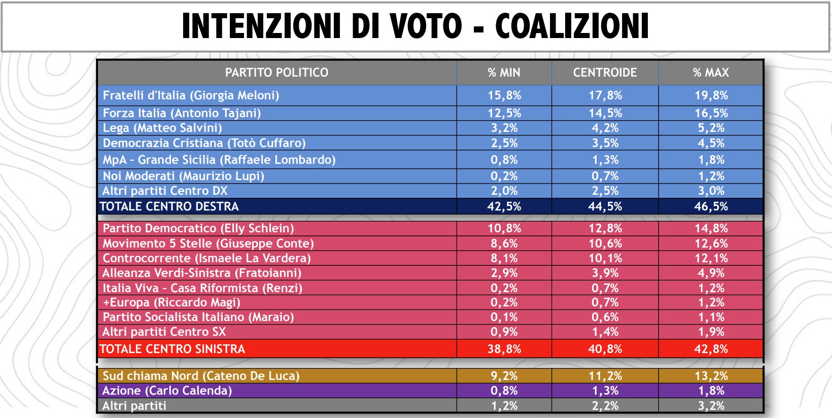 E anche le rilevazioni sulle liste (le urne hanno quasi sempre smentito gli istituti demoscopici che non riescono a misurare il voto “strutturato” legato al trascinamento dei candidati all’Ars) vanno prese con le pinze. Giusto però per farsi un’idea: il centrodestra resta in vantaggio (con FdI al 17,8%, Forza Italia al 14,5% e Lega in bilico rispetto alla soglia di sbarramento, sotto la quale il sondaggio colloca Dc, Mpa e Noi Moderati), ma il vantaggio oggi registrato sul fronte progressista (dove il Pd è la prima forza con il 12,8% e Controcorrente tallona il M5S poco sopra il 10%, mentre Avs è al di sotto delle proiezioni nazionali con Italia Viva a cifre decimali) è alquanto basso: circa il 4%.