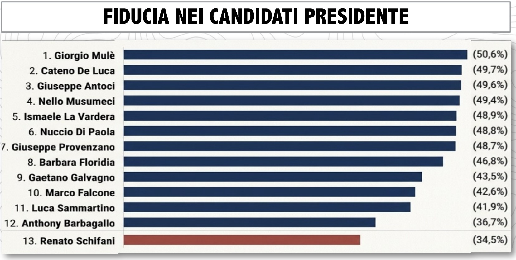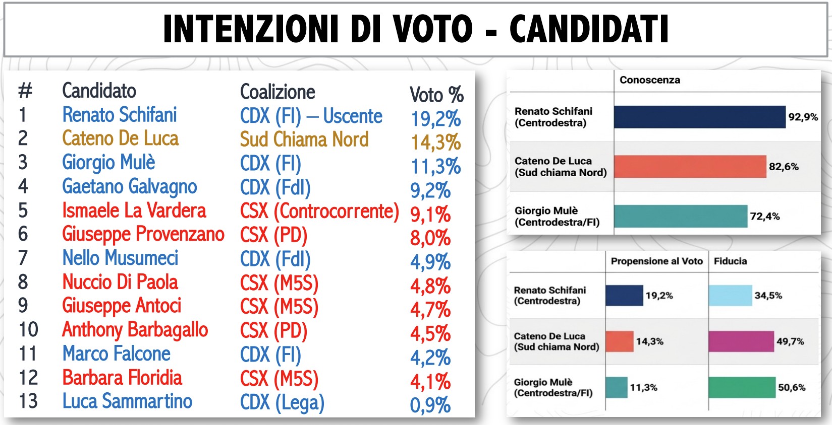Fra centrodestra e progressisti appena il 4%, ScN decisivo. Schifani perde fiducia (Mulè primo), ma resta il più forte. La Vardera e Provenzano i preferiti nel centrosinistra. Liste: FdI supera Fi, Lega in bilico; Pd in avanti e Controcorrente appaia il M5S