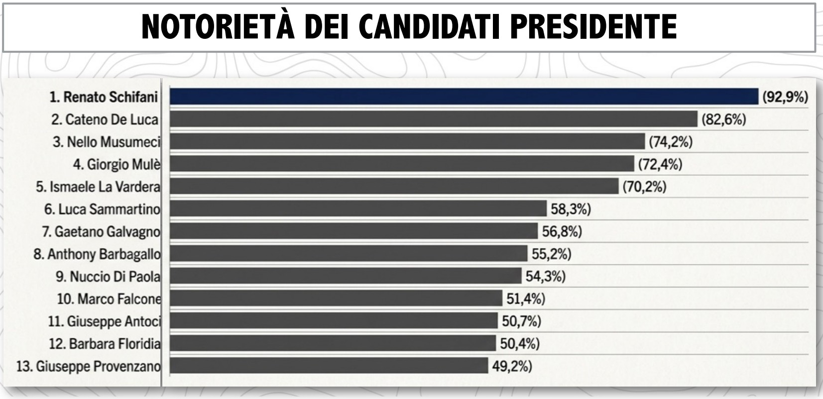 Veniamo al dunque. Renato Schifani, nonostante sia il potenziale candidato con il livello di fiducia più basso (32,5%) (contro il 50,6% dell’altro forzista Giorgio Mulè, al primo posto) è ovviamente il più conosciuto. E comunque il primo nelle intenzioni di voto: 19,2%, seguito da De Luca (14,3%) e dallo stesso Mulè (11,3%). Poi Gaetano Galvagno (9,2%) e Ismaele La Vardera, primo del centrosinistra (9,1%) con un punto di vantaggio sul dem Peppe Provenzano. Molto più distanti, e comunque tutti al di sotto del 5%, gli altri competitor sondati: dal 4,9% di Nello Musumeci all’1% di Luca Sammartino, con in mezzo i 5stelle Nuccio Di Paola, Giuseppe Antoci e Barbara Floridia (fra il 4,8 e il 4,1%) poco sopra il segretario regionale del Pd, Anthony Barbagallo e l’eurodeputato di Forza Italia, Marco Falcone.