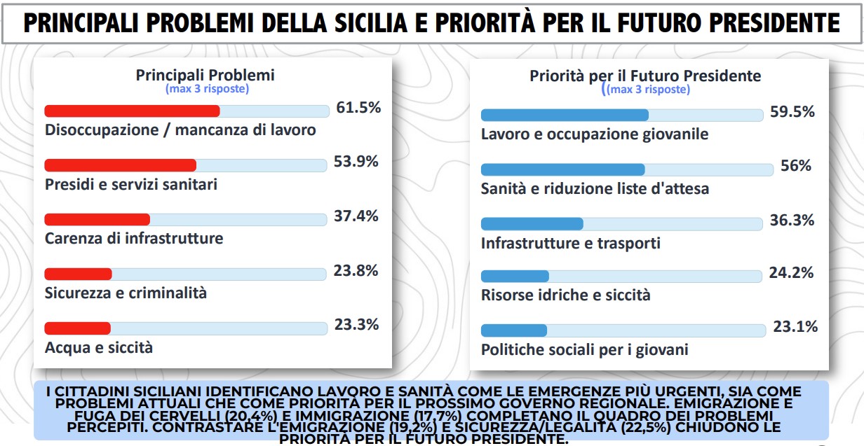 «I cittadini siciliani identificano lavoro (60% circa) e sanità (55%) come le emergenze più urgenti, sia come problemi attuali sia come priorità per il prossimo governo regionale», si legge nel report di Lab21.