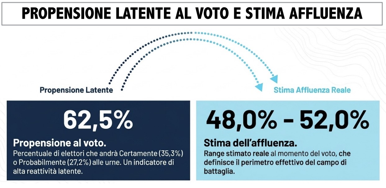 «In un contesto di astensione strutturale così marcata, la capacità di mobilitare i propri elettori certi diventa determinante quanto quella di convincere i dubbiosi. Un’affluenza nella fascia bassa della forchetta (48%) tende a favorire le basi più ideologicamente motivate; una nella fascia alta (52%) apre spazio agli elettori di opinione più tiepidi — tipicamente più sensibili alle candidature personali forti». Una riflessione strettamente legata alla percezione di una classe dirigente regionale incapace di risolvere le questioni più importanti.
