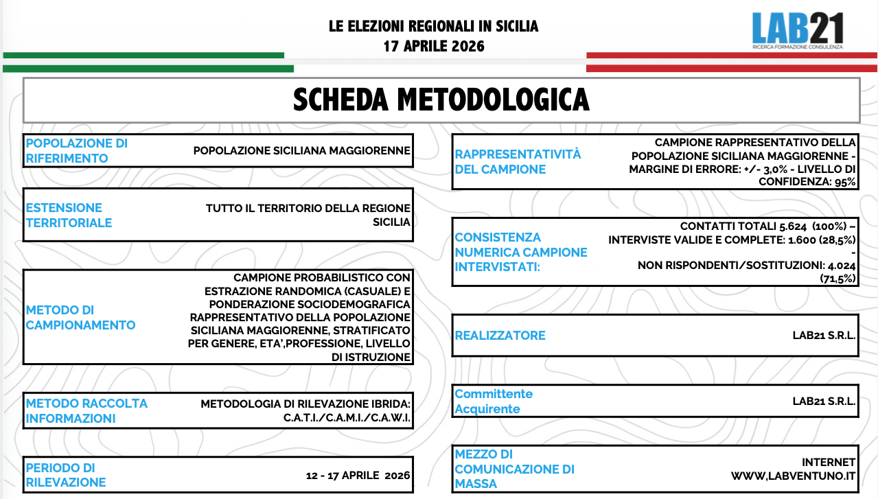 Ma "Lab21" fornisce una lettura ben precisa: «La fotografia demoscopica della Sicilia 2026 è quella di una competizione aperta su un crinale preciso: non tra centrodestra e centrosinistra, ma tra chi riuscirà a cooptare l’11% che pende in mezzo. Schifani ha il vantaggio strutturale della coalizione più grande e del voto presidenziale più alto. Ma la matematica elettorale siciliana, in questo momento, è scritta con il segno di De Luca. Eppure, anche in contesti apparentemente definiti, la demoscopia insegna prudenza: l’elevata quota di indecisi (38,3%), le variabili di mobilitazione e la qualità della campagna elettorale possono sempre introdurre elementi di imprevedibilità». Meno male, altrimenti finirebbe tutto il divertimento che ci attende da qui alle prossime elezioni regionali.