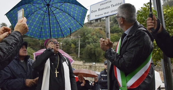 Inaugurazione bagnata, inaugurazione fortunata. E più fortuna non si poteva prevedere visto che, di fatto, la cerimonia è stata caratterizzata da un forte acquazzone. Nonostante tutto, il sindaco di Ragusa Peppe Cassì e il vescovo della diocesi, mons. Giuseppe La Placa, hanno voluto essere presenti e partecipare in maniera attiva alla cerimonia nel corso della quale è stata intitolata una piazzetta adiacente alla via Avvocato Giovanni Ottaviano, a Ibla, al sacerdote Romolo Taddei, scomparso a 79 anni, il 19 novembre del 2020.
