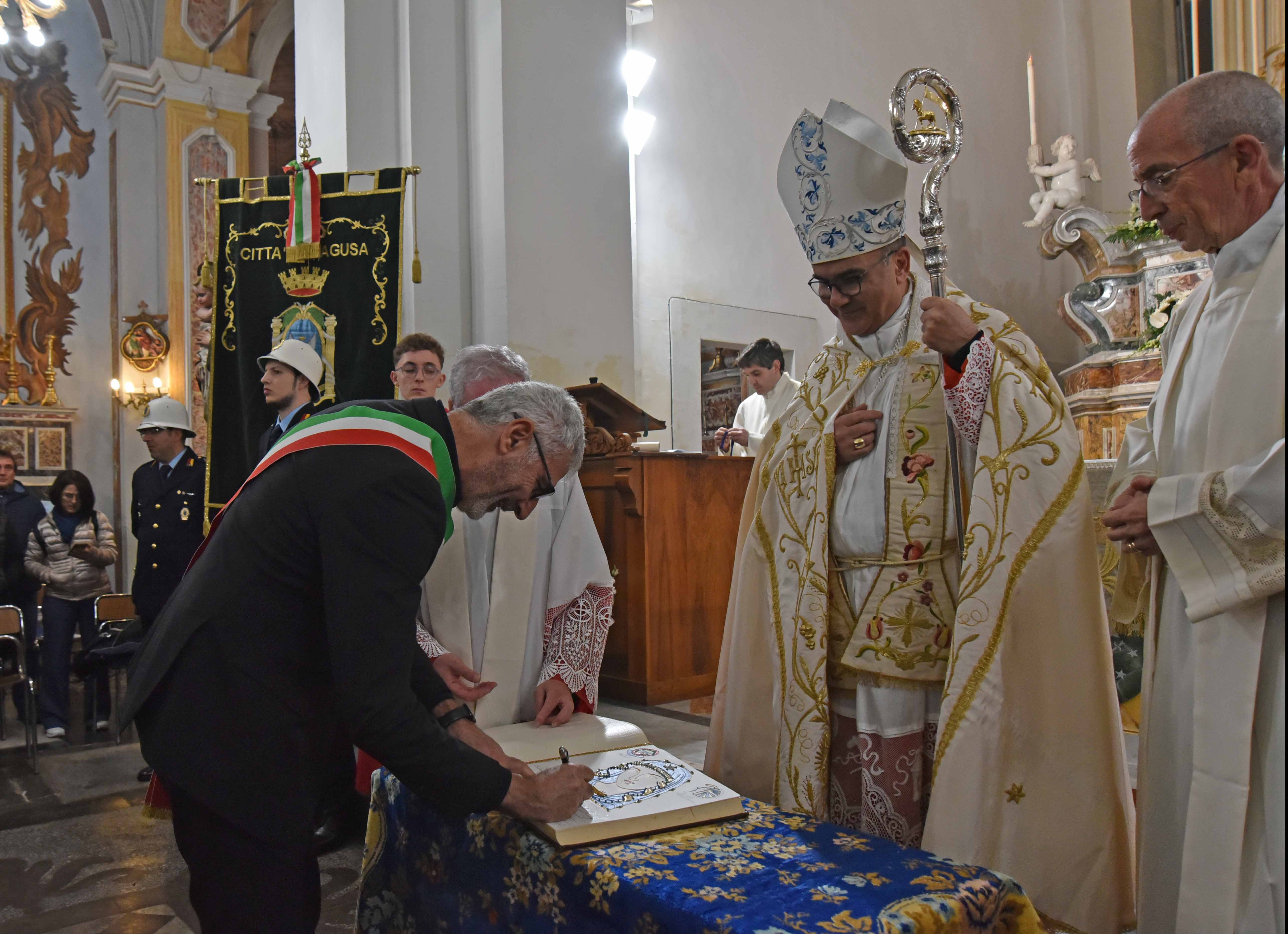 «Vigilate maternamente su questa città – ha letto, tra l’altro, il sindaco, alla presenza delle autorità civili e militari cittadine e provinciali, rivolgendosi alla Vergine – allargate su di essa il vostro manto immacolato, pegno e garanzia di prosperità e di pace. Insieme con la Città io Vi affido, o Vergine Immacolata, la nostra terra ed i nostri monti, gli interessi spirituali e temporali, il presente e l’avvenire, le nostre culle e le nostre tombe, la nostra vita e la nostra morte». Quindi il sindaco ha acceso un cero votivo e ha reso un omaggio floreale alla statua dell’Immacolata. Subito dopo, il prefetto di Ragusa, Giuseppe Ranieri, il questore Vincenzo Trombadore, il presidente del Consiglio comunale Fabrizio Ilardo e altri rappresentanti delle istituzioni (c’erano consiglieri comunali di Ragusa ed esponenti di vertice dei comandi dei carabinieri, della polizia, delle Fiamme gialle e della Capitaneria) hanno apposto la loro firma, così come anche il vescovo e il primo cittadino, sul registro delle autorità. I registri delle firme delle autorità, vere opere d’arte, furono istituiti con la nascita della Diocesi di Ragusa e sono stati realizzati dai rinomati Antonino Cannì, Rocco Cafiso e Maria Imposa. Uno degli ultimi tra questi reca, tra l’altro, la firma del presidente emerito della Repubblica Italiana, Carlo Azeglio Ciampi.
