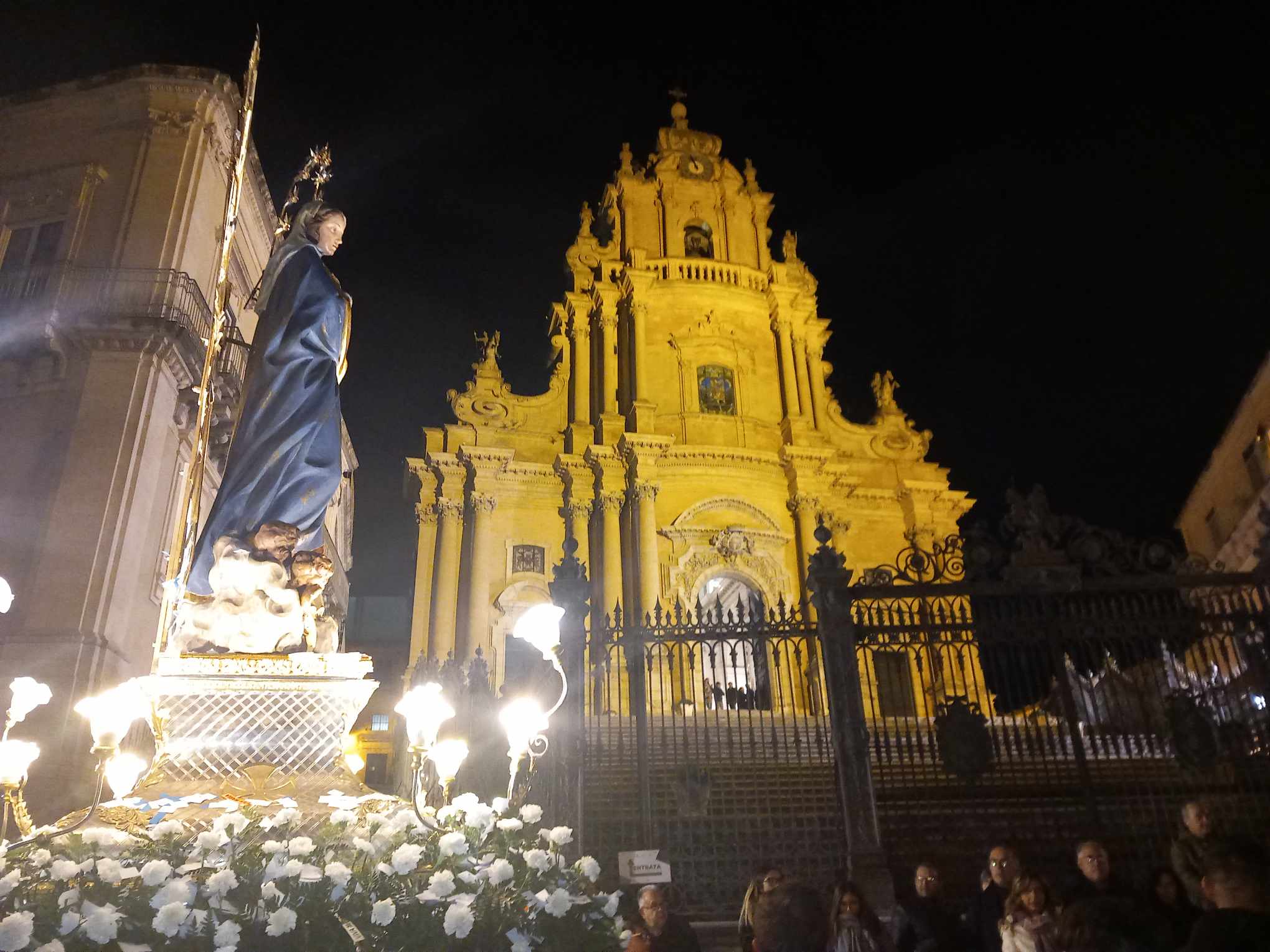 La processione è stata anche un modo per mettere in evidenza la santità e la purezza di Maria. Lo ha ricordato il rettore della chiesa di San Francesco all’Immacolata, padre Pietro Floridia, parroco del duomo di San Giorgio, durante l’omelia che ha preceduto il corteo religioso. Quest’ultimo si è snodato per le principali vie del quartiere barocco. I fedeli hanno poi fatto ritorno in chiesa, sollecitati da una leggera pioggia, dove il simulacro è stato riposto (le foto sono di Salvo Bracchitta).