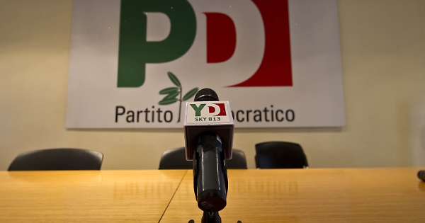 Il simbolo del Pd sulla parete dietro alla scrivania vuota su cui c'e' il microfono dal quale ha parlato il segretario del Pd Pierluigi Bersani nella sede del Partito democratico a Roma, 11 novembre 2010. "Attenzione ai pannicelli caldi e a perdere tempo. Il Paese ha bisogno di organizzare una ripartenza e di ripristinare un confronto politico. La crisi va messa in chiaro e nessuno può perdere tempo", ha detto Bersani. ANSA / MASSIMO PERCOSSI