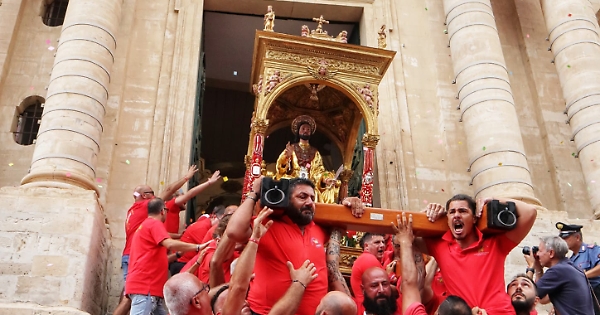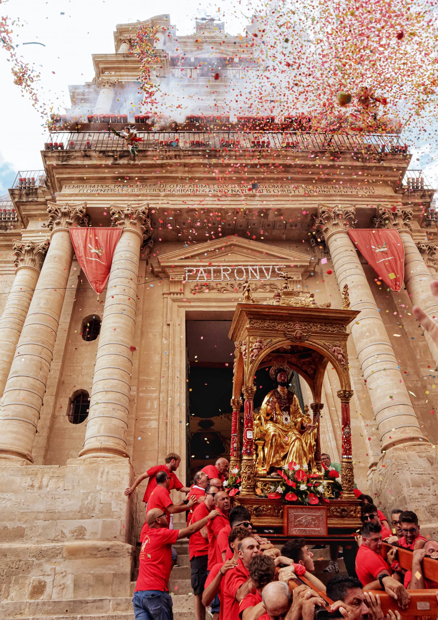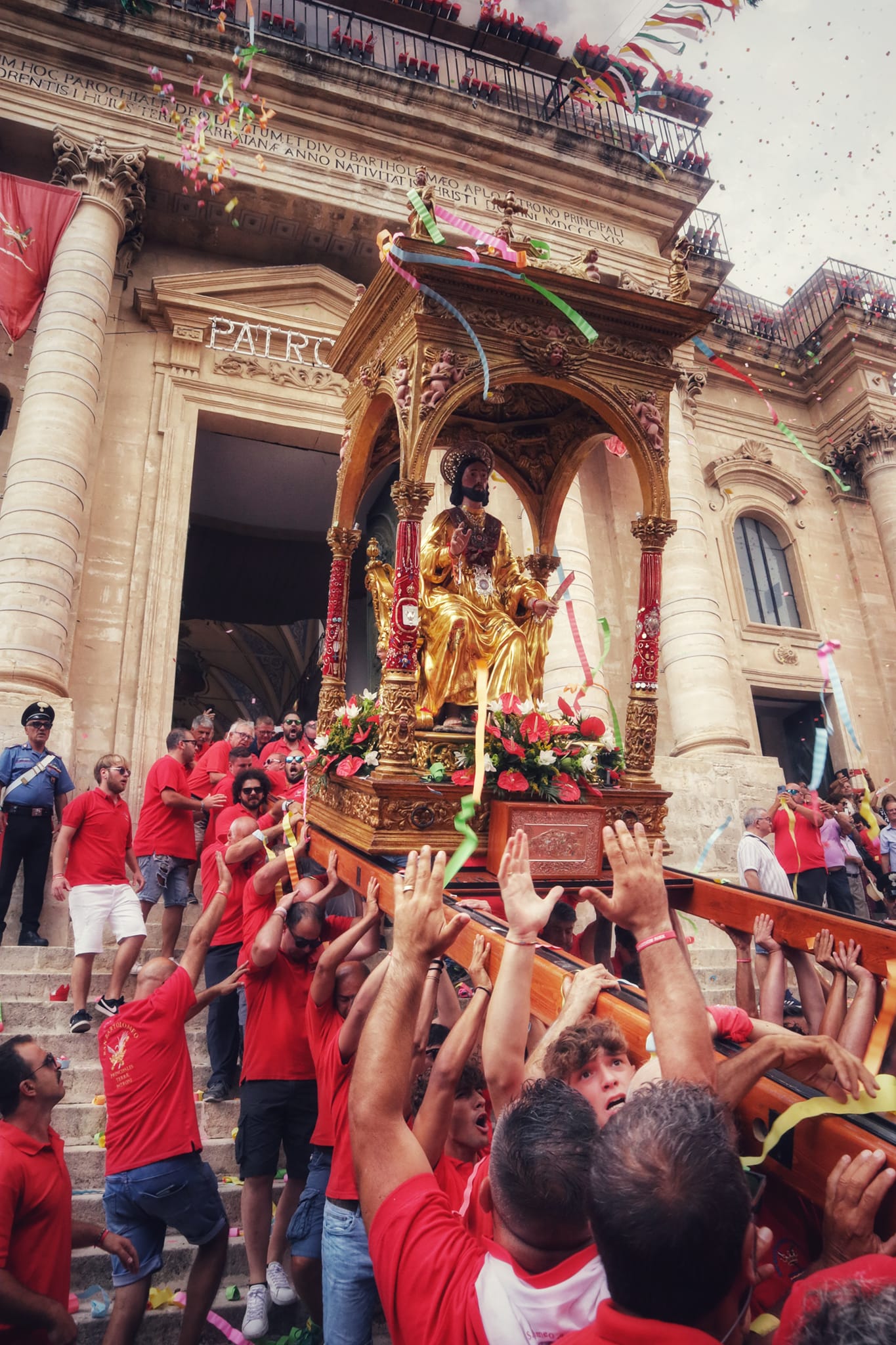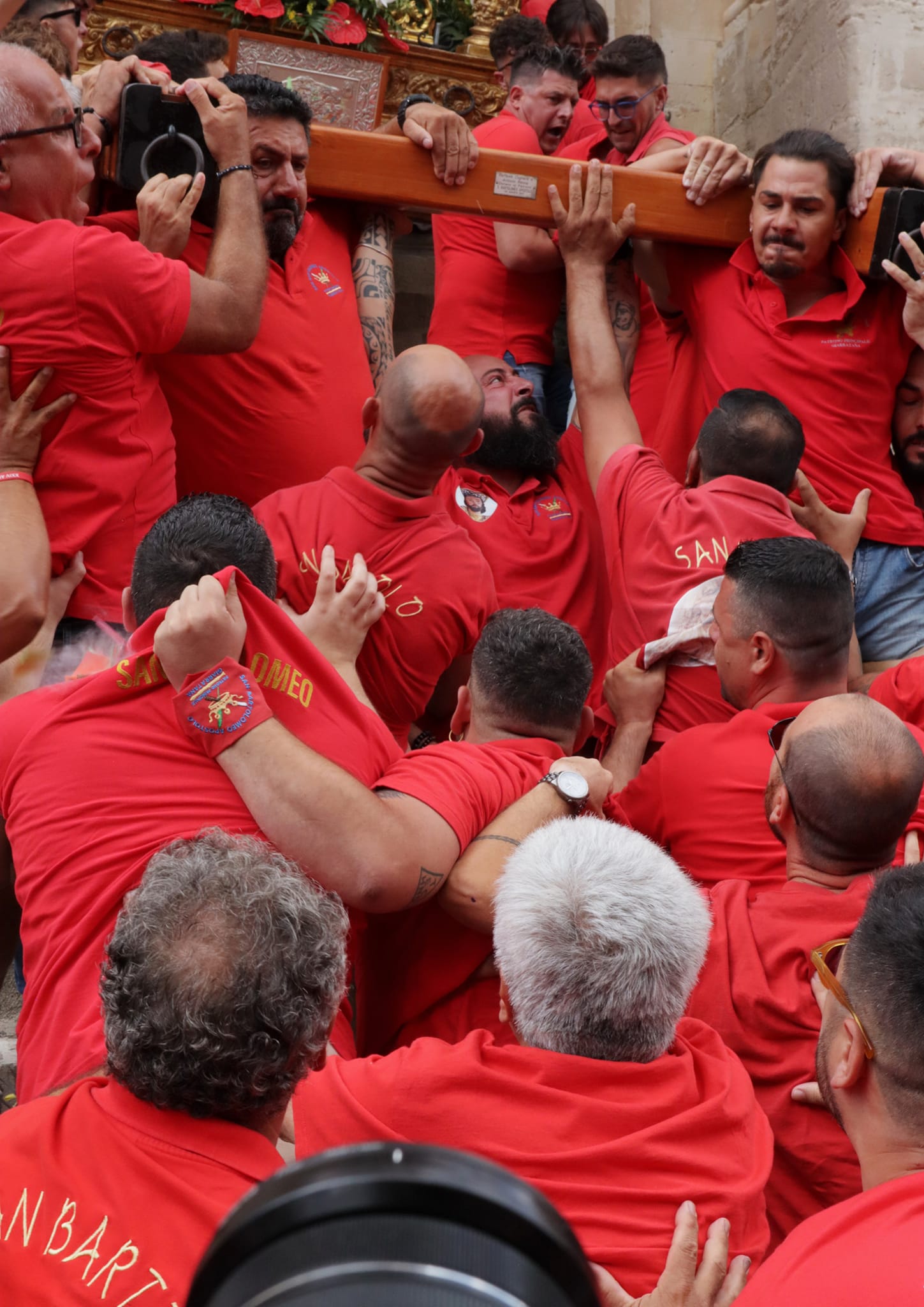 Una “Sciuta” fantasmagorica. Con colori a tempesta. E un grido assordante a uscire dal cuore e a sovrastare fedeli e devoti: “Iautu u Patronu”. Tutto ciò mentre un’onda umana si muove come se fosse animata da un’unica mano. Braccia tese allo spasimo. Per reggere il simulacro. In un istante le ripide scalinate della basilica sono affrontate come se nulla fosse. Momenti suggestivi, emozionanti, carichi di devozione e allo stesso tempo straordinari per chi è curioso di ammirare il folklore che deriva dalla storia. Roba da rimanere a bocca aperta. Tutto questo, e molto altro ancora, ha animato il tradizionale appuntamento di San Bartolomeo apostolo che, come ogni anno, si è consumato quest’oggi, 24 agosto, a Giarratana.