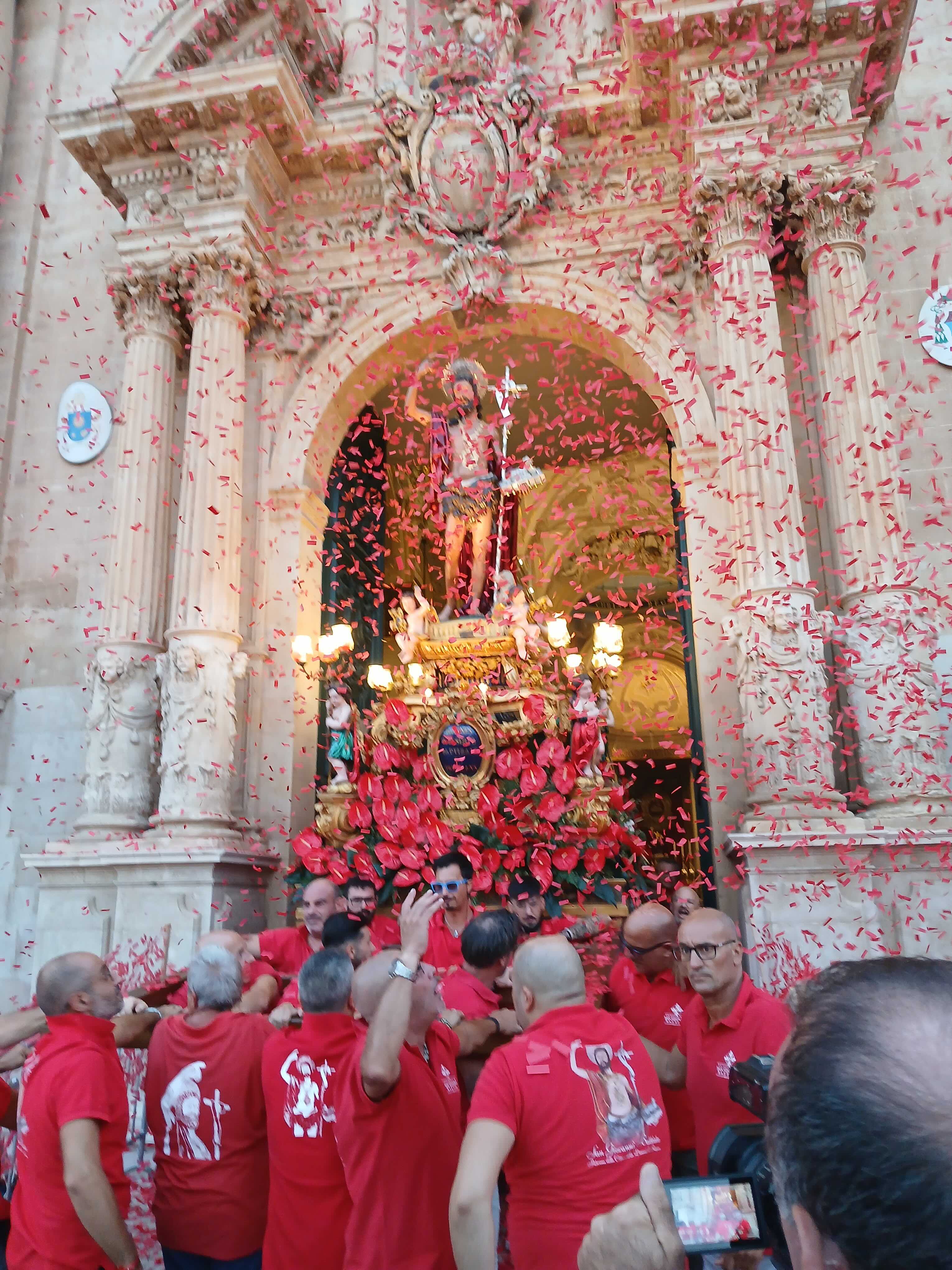Subito dopo, l’inizio della solenne processione del patrono. Prima, come detto, l’uscita dell’Arca santa, seguita dai fedeli con i ceri votivi. Subito dopo, l’uscita del venerato simulacro del patrono che è stato accolto sul sagrato dal tradizionale lancio di volantini colorati, dal suono a festa delle campane, dallo sparo dei fuochi d’artificio. Alla processione hanno partecipato il vescovo di Ragusa, le autorità civili e militari, i canonici del capitolo della Cattedrale, il clero, i religiosi e le religiose. La processione si è snodata lungo le vie principali del centro storico.