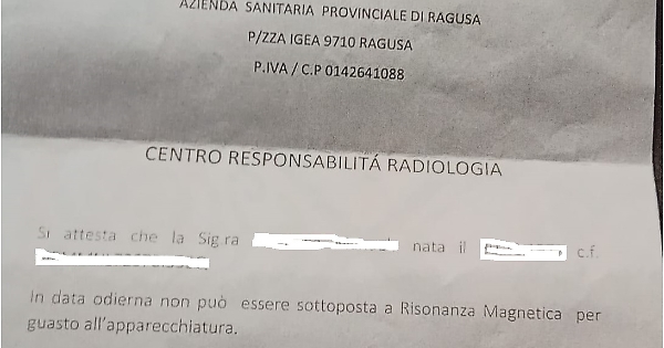 Ancora una volta siamo costretti a denunciare disservizi particolarmente gravi all’interno dell’Asp di Ragusa". Lo sottolinea il comitato civico Articolo 32. "Il 30 agosto - sottolineano i componenti del comitato - una paziente oncologica si presenta all’ospedale di Modica perché da tempo prenotata per una risonanza magnetica al cervello. Giunta in ospedale apprende che l'attrezzatura è guasta e naturalmente attende che sia indirizzata verso un’altra struttura. Una struttura pubblica o privata che sia  ma, comunque (come prevede una norma del 1998), a carico del servizio sanitario. E, invece, per iscritto viene invitata ad arrangiarsi anche se con linguaggio burocraticamente edulcorato. A questo proposito riproduciamo copia di una stucchevole dichiarazione del medico con tanto di firma e timbro" (nella foto sopra).