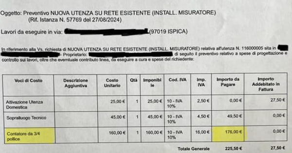 “Iblea Acque – ancora Monaca – continua ad applicare pratiche commerciali scorrette che gravano sui cittadini, i quali sono ormai stanchi di subire ingiustizie e soprusi. È inaccettabile che chi dovrebbe fornirci un servizio essenziale giochi con la nostra fiducia e i nostri diritti. Basta essere tartassati senza motivo, è giunto il momento di alzare la voce e chiedere equità e trasparenza. Gli utenti e consumatori meritano rispetto e chiarezza, non bollette errate, costi ingiustificati e abusi vari. Facciamo sentire la nostra voce, adesso è il momento di agire. Quindi invitiamo l’utenza a rispondere a chi chiede di pagare il contatore che tutto ciò non è assolutamente previsto da nessuna parte, nemmeno dal vigente regolamento idrico, ed eventualmente di segnalare queste anomalie. Per quanto mi riguarda, sto provvedendo a trasmettere una pec, nella qualità di consigliere del Comune di Ispica, all’Ati Ragusa evidenziando, carte alla mano, cosa non va. Dobbiamo cercare di fare chiarezza perché non è possibile continuare in questo modo. Lancio un invito, a chi veramente ha facoltà, di intervenire il prima possibile”. Il consigliere Monaca, poi, mette in rilievo un altro aspetto. “Attraverso una mia ricerca online – spiega – ho verificato che i contatori indicati nel preventivo, realizzati da un’azienda che si chiama Maddalena, hanno un costo sul mercato, almeno quelli con caratteristiche analoghe a quelli proposti da Iblea Acque, che si aggira intorno ai 60-65 euro. Quindi, attraverso il Mepa, sarebbe possibile individuare questi dispositivi a un costo notevolmente inferiore. Ritengo, dunque, che tutto ciò non sia corretto, ammesso naturalmente che il costo del contatore sia in carico all’utente e come abbiamo visto non è così. Quindi, è importante che, ancora una volta, si possano difendere i nostri diritti di consumatori e di utenti, in particolare quando si parla di un servizio così importante e sensibile come quello idrico”.
