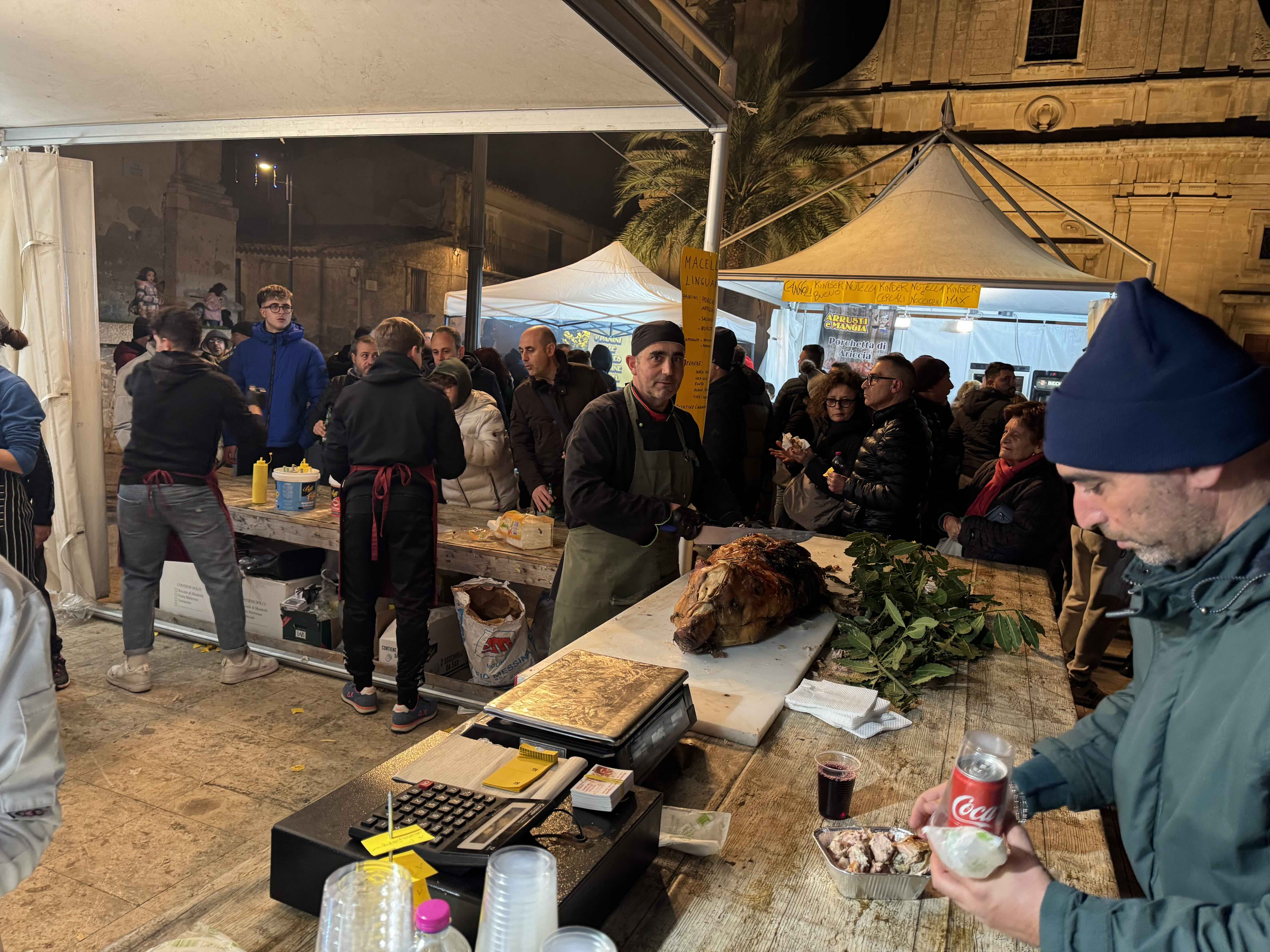 L’iniziativa, promossa dal comitato Cerretanum in collaborazione con il Comune, nell’ambito degli appuntamenti che caratterizzeranno il Natale 2024, ha consentito di mettere in vetrina l’eccellente qualità delle carni locali molto apprezzate dai visitatori. I panini con la porchetta ma anche con la salsiccia sono andati via nel corso della serata grazie al notevole afflusso di persone riversatesi nei vari stand enogastronomici allestiti per l’occasione. A rendere il tutto più interessante, l’esibizione dal vivo del gruppo formato da musicisti e cantanti provenienti da Buccheri, Palazzolo e Ferla che hanno tenuto incollati i presenti ad ascoltare le loro proposte musicali sino a tarda ora.
