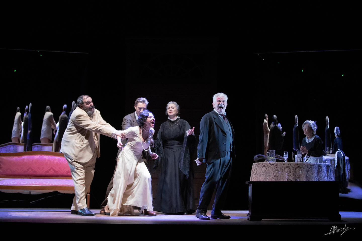 Enrico Guarneri interpreta Ciampa, uno dei grandi eroi pirandelliani. “Ciampa – sottolinea il regista Gugliemo Ferro – è “Il berretto a sonagli”. Un individuo complesso, legato alla sua reputazione e alle apparenze, tanto che uno dei temi centrali della commedia è proprio il conflitto tra essere e apparire. Nel contesto siciliano, Ciampa è vittima e artefice di una mentalità sociale intrisa di tradizione e onore. La “corda pazza”, un concetto introdotto da Ciampa stesso, rappresenta quella parte irrazionale e selvaggia presente in ognuno di noi, che si nasconde dietro le convenzioni sociali. Secondo Ciampa, ogni individuo ha tre corde nell’anima: la “corda seria” (quella della ragione e della responsabilità), la “corda civile” (quella che ci permette di convivere in società) e la “corda pazza” (quella che ci rende capaci di gesti estremi, irrazionali, quando non si riesce più a sopportare la pressione della vita sociale)”. “Pirandello – aggiunge Ferro – attraverso il protagonista e le sue teorie, riflette sulla natura umana, il concetto di identità e la crisi tra l’essere autentico e l’apparenza pubblica. Questo rimanda a tematiche filosofiche profondamente siciliane, ma anche universali. La società siciliana, con le sue radici nei pupi, nel teatro di marionette, riflette spesso le dinamiche dell’onore, dell’inganno e della maschera, tematiche presenti anche in questa opera. I pupi siciliani rappresentano in modo simbolico la rigidità delle convenzioni sociali, dove ognuno ha un ruolo da interpretare, un po’ come le maschere che Ciampa è costretto a indossare per sopravvivere”.