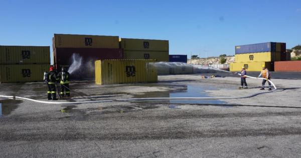 Container in fiamme al porto di Pozzallo ma era solo un'esercitazione antincendio organizzata dalla Capitaneria di Porto, alla quale ha partecipato il personale del comando provinciale dei Vigili del Fuoco, del distaccamento di Modica ed il team N.B.C., nonché il personale del 118 e quello delle imprese portuali.