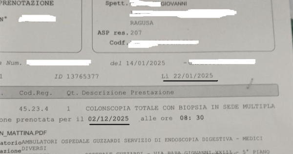 "Il 21 gennaio - continua il comitato - facciamo due tentativi a Pozzallo e Ispica sperando che almeno in uno di essi Cup abbiano risolto il problema. Il 22 a Scicli i codici sono finalmente aggiornati. Ma l’operatore di sportello conferma la plateale violazione di legge comunicando: l’ agenda per la colonscopia è chiusa. Lo stesso giorno a Modica (palazzo di vetro) la ricetta viene respinta e si invita il paziente a rivolgersi al proprio medico per modificare i codici. Ma non tutto è perduto… Lo stesso giorno 22 poco prima della chiusura degli uffici del Cup ci arriva la notizia che la stessa ricetta, respinta a Modica qualche ora prima, è stata accolta a Pozzallo : la colonscopia è stata prenotata. Finalmente una buona notizia …… si fa per dire. L’appuntamento è fissato tra 11 mesi : il 2 dicembre 2025 ! (come dimostra l’allegato). A questo punto il signor Giovanni può scegliere di mettere mano al portafoglio, se ne ha la possibilità, e ottenere la prestazione a pagamento. Altrimenti potrà aggiungere il suo nome ai milioni di italiani vittime di questa macelleria sociale che colpisce la sanità, come le pensioni e trasforma i diritti sociali in privilegi per pochi".