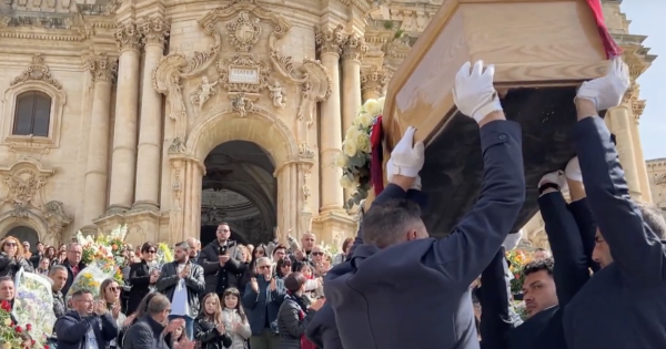 Una persona solare, ottimista. E sempre positiva. Con queste parole gli amici hanno descritto Peppe Giurdanella, il trentacinquenne modicano rimasto vittima di un incidente stradale avvenuto lo scorso 2 marzo in contrada Bussello a Ragusa. Questa mattina, nel giorno dei funerali, molta la commozione all'interno del Duomo di San Giorgio. Un'intera comunità si è stretta attorno alla famiglia di Peppe Giurdanella devastata dal dolore per la prematura scomparsa del giovane che ha lasciato la moglie e due figlie piccole. Ad accogliere il feretro all'uscita dal Duomo anche una delegazione del Modica Calcio e dei tifosi del gruppo organizzato del quale Peppe Giurdanella faceva parte. Entrambi lo avevano omaggiato in occasione della partita di domenica scorsa tra i rossoblù e il Milazzo. Il giorno dell'incidente stradale Giurdanella si stava recando a Palazzolo proprio per seguire il Modica in trasferta.
