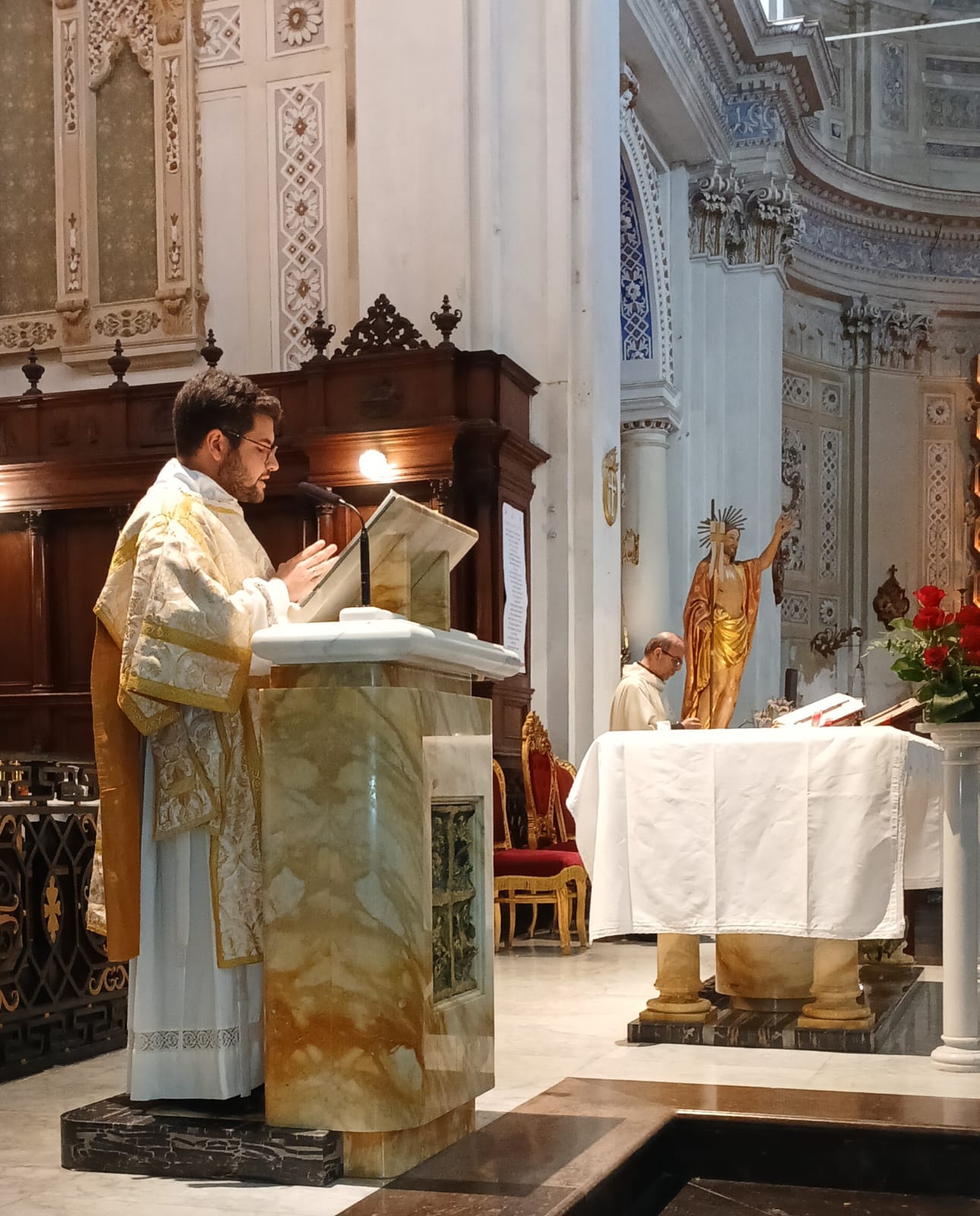 E’ iniziato ieri sera il triduo in onore di Santa Rita da Cascia all’Ecce Homo di Ragusa. In particolare, dopo la recita del Rosario e la preghiera a Santa Rita, moglie, madre e vedova consacrata, nel pomeriggio la celebrazione eucaristica è stata presieduta dal parroco, il sacerdote Salvatore Vaccaro, con omelia del diacono don Alessio Leggio (nella foto sotto). Oggi, secondo giorno del triduo, recita del Rosario e preghiera a Santa Rita alle 18,30 e messa vespertina alle 19 con omelia del diacono Gianni Corallo. A occuparsi della diffusione mediatica dell’evento religioso l’impresa Gali group trasporti e logistica di Ispica che ha voluto puntare l’accento sul significato di questa celebrazione per la città di Ragusa (le foto sono di Salvo Bracchitta).