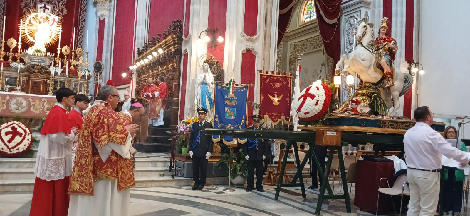 Altre, poi, le novità che hanno caratterizzato l’edizione 2025 dei solenni festeggiamenti. Elementi tradizionali ma innovativi rispetto al passato che hanno messo in rilievo come questo evento religioso stia ormai facendo registrare un grado di attenzione molto particolare in ambito provinciale e regionale. Sono state decine le migliaia di fedeli e di ferventi sostenitori del santo martire, provenienti da ogni dove, che non hanno voluto mancare all’appuntamento clou delle celebrazioni. La città antica di Ragusa ieri, per tutta la giornata, è stata letteralmente invasa da un fiume di persone. Più di 60mila, secondo le stime degli organizzatori. Ancora una volta, una presenza oltre ogni più rosea previsione. E’ stato il vescovo della diocesi di Ragusa, mons. Giuseppe La Placa, ieri pomeriggio, a presiedere la santa messa solenne concelebrata alla presenza del parroco del duomo, don Giuseppe Antoci, e di altri sacerdoti. Mons. La Placa, durante la funzione tenutasi alla presenza delle massime autorità civili e militari (c’era anche il sindaco di Castelmola, Antonino Orlando Russo, per animare una sorta di gemellaggio visto che il megalomartire è patrono anche del Comune messinese), ha tenuto a ricordare le peculiarità del santo cavaliere e quanto la sua figura, ancora oggi, sia parecchio attuale. “Non dimentichiamoci – ha sottolineato il presule – che San Giorgio ha vissuto il Vangelo con coerenza anche quando si andava controcorrente. Un soldato che non ha avuto alcun ripensamento nel momento in cui è stato chiamato a difendere la propria fede”. E richiamando i cristiani, ha esortato a dire “no alle apparenze e alle esteriorità” e ha invocato ad avere “un cuore docile e coraggioso”. E poi parlando dei problemi che attanagliano i giorni nostri, mons. La Placa ha detto: “No alla pace apparente e fragile, come spesso il mondo promette e non mantiene. Dobbiamo essere tutti i giorni uomini e donne di pace. Che non si compie certo con le armi della violenza e della prepotenza, bensì con la forza mite del Vangelo”.