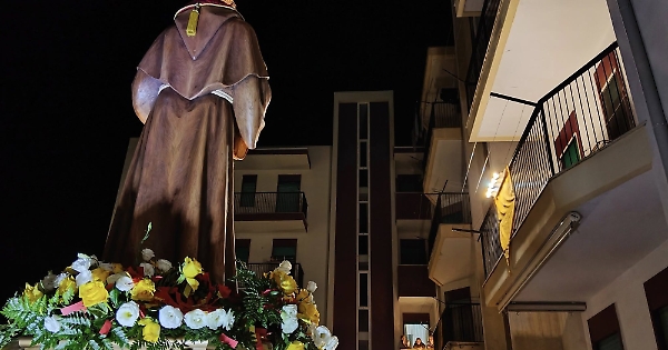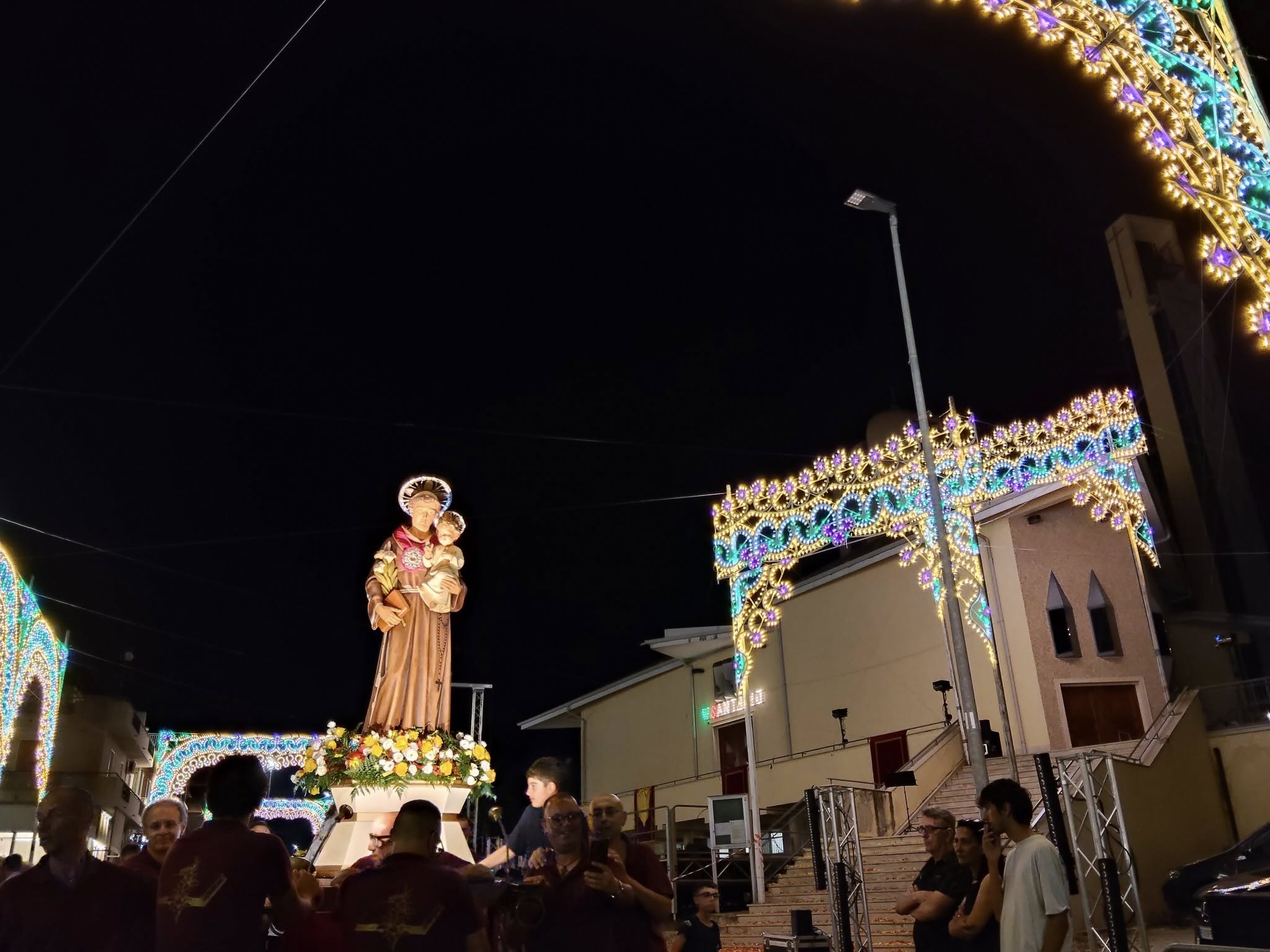 A conclusione della celebrazione, la festosa uscita del venerato simulacro di Sant’Antonio di Padova, salutata dal suono delle campane, dalla coreografia di volantini colorati e dall’inno sinfonico della parrocchia. Subito dopo ha preso il via la solenne processione che ha interessato la maggior parte delle vie del territorio parrocchiale. All’arrivo della processione sul sagrato della chiesa, si è svolto uno spettacolo di luci, musica ed effetti scenografici. Subito dopo, a ricordo della carità di Sant’Antonio, la benedizione e la distribuzione del pane. Quindi, il rientro del simulacro in chiesa e la preghiera di affidamento alla sua intercessione.