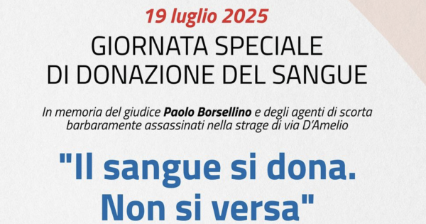 Sabato 19 luglio, in occasione del 33° anniversario della strage di via D’Amelio, il Servizio di Immunoematologia e Medicina Trasfusionale (SIMT) dell’Asp di Ragusa, in collaborazione con l’Avis, organizza una giornata speciale di donazione del sangue in memoria del giudice Paolo Borsellino e degli agenti della sua scorta.
