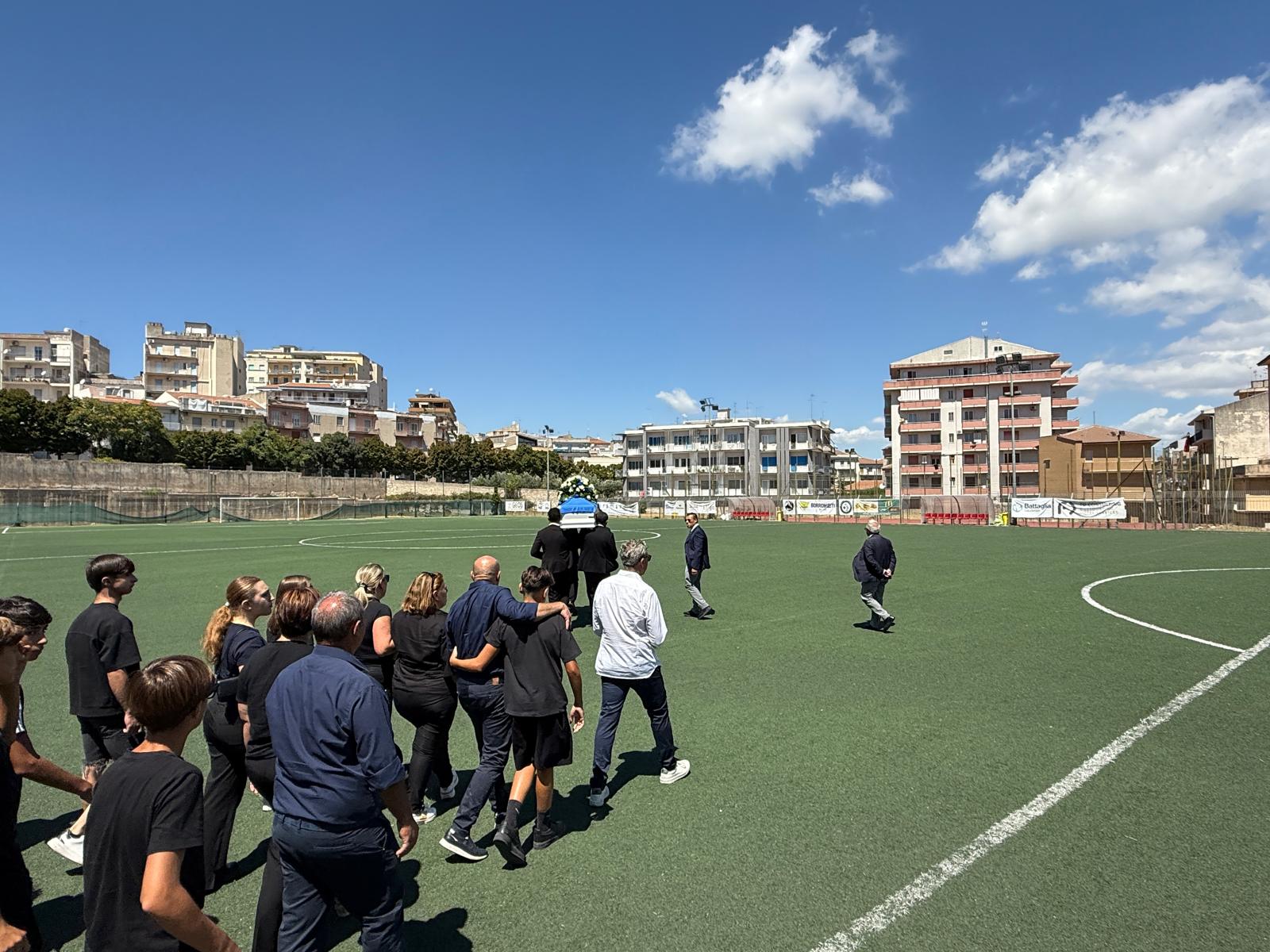 Il commovente saluto ad Andrea Passalacqua allo stadio Gianni Biazzo (ex Enal) di via Archimede, dove aveva giocato con la maglia del Ragusa Boys. Il corteo, dopo i funerali e prima della tumulazione al cimitero, è stato accolto dalla società sportiva con i testa il responsabile Adriano Garozzo. Momenti di straziante dolore per i familiari sino a quando il feretro non è stato portato al centro del campo ed alzato al cielo. Numerosi gli attestati di cordoglio alla famiglia dopo che il tragico incidente con il trattore ha impedito ad Andrea di coltivare qualsiasi sogno per il futuro. Una giovane vita spezzata, l'ennesima, in provincia di Ragusa, di questa tragica estate (foto Martorana).
