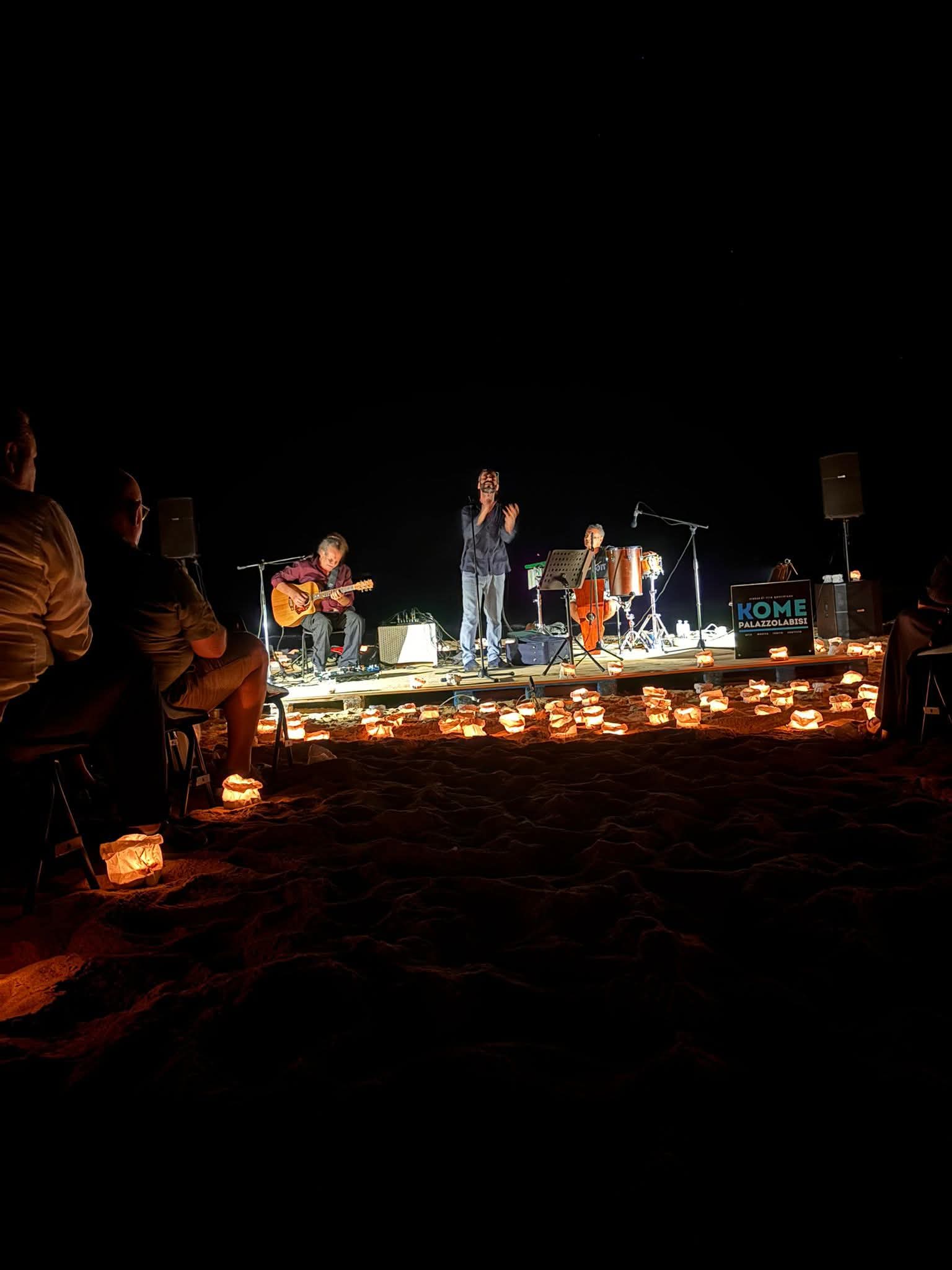 L’atmosfera, resa magica dalla luce tremula di mille candele, è stata arricchita dal sottofondo delle onde del mare e da una stella cadente, piovuta proprio alle spalle degli artisti a circa metà concerto. Il trio, rigorosamente live, ha emozionato i presenti con le più celebri canzoni del grande Lucio, spesso con interpretazioni e arrangiamenti personali dell’istrionico Giuffrida.