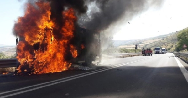 RAGUSA - Un autocarro che trasportava bevande ha preso fuoco mentre era in marcia sulla Ragusa-Catania. L’incendio si è sviluppato al Km 2 della Strada Statale 514 ed è stato originato da un guasto all’impianto elettrico che ha rapidamente coinvolto il veicolo senza danni per il conducente né per gli altri mezzi in transito al momento del sinistro. I vigili del fuoco hanno rapidamente avviato le operazioni di spegnimento riuscendo ad avere ragione delle fiamme. Dopo aver spento l’incendio e messo in sicurezza l’area, è stata ripristinata la viabilità in attesa che il mezzo venisse rimosso. La Polstrada di Ragusa è intervenuta per disciplinare la circolazione delle auto.
