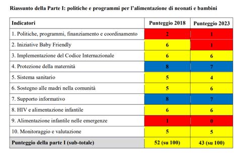 Il rapporto per l’Italia è stato elaborato da Ibfan Italia con l’aiuto, il consenso e la condivisione di intenti di altre associazioni ed istituzioni che si occupano di allattamento e non solo. Il punteggio medio assegnato all’Italia è 67 su 150, un valore di 6 punti in meno rispetto al 2018, un valore che piazza il nostro Paese nella fascia gialla, a indicare che è necessario prestare ancora molta attenzione all’allattamento.