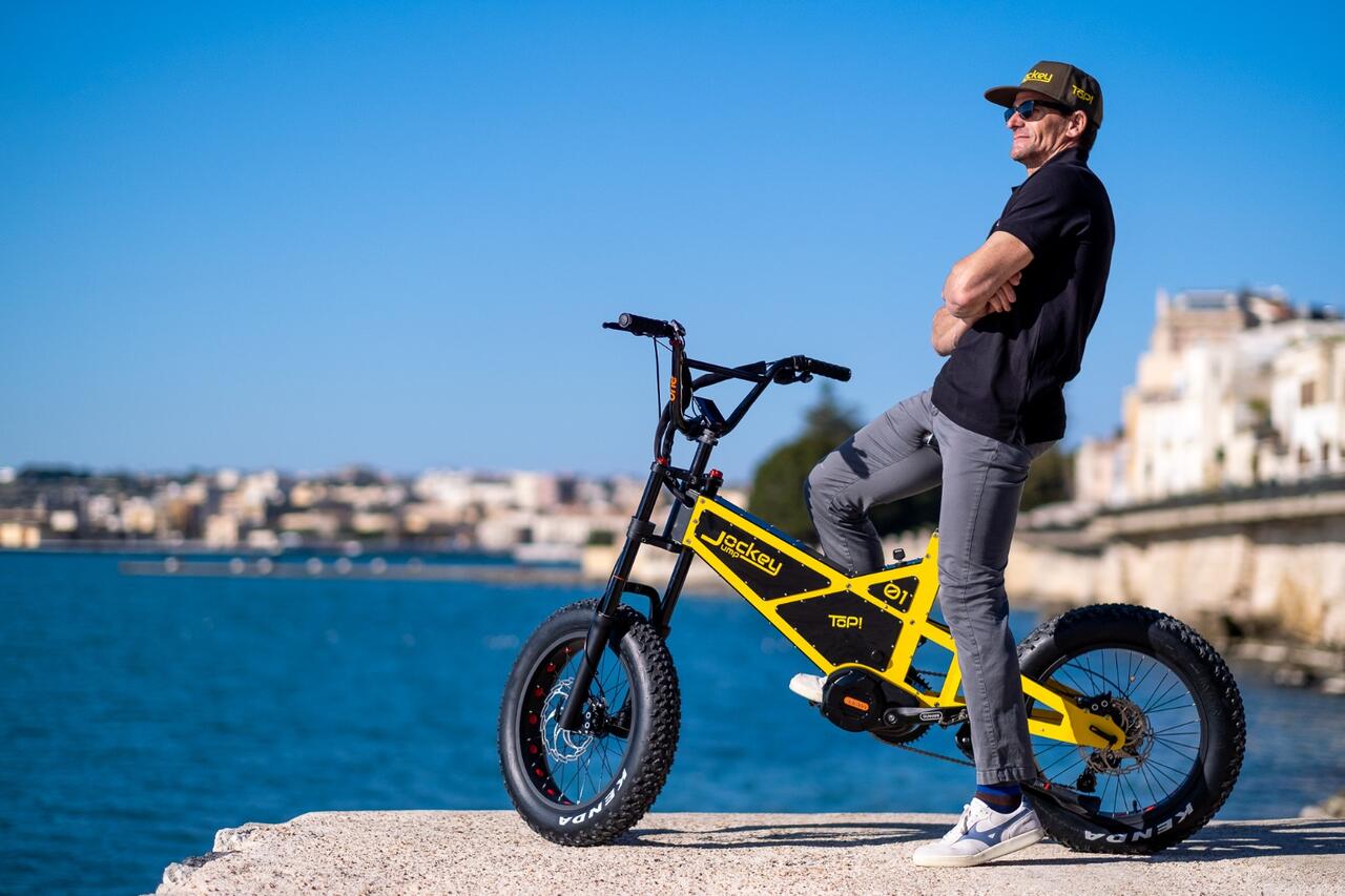 Gibilisco con la bici elettrica “Jockey Jump”, che ha realizzato