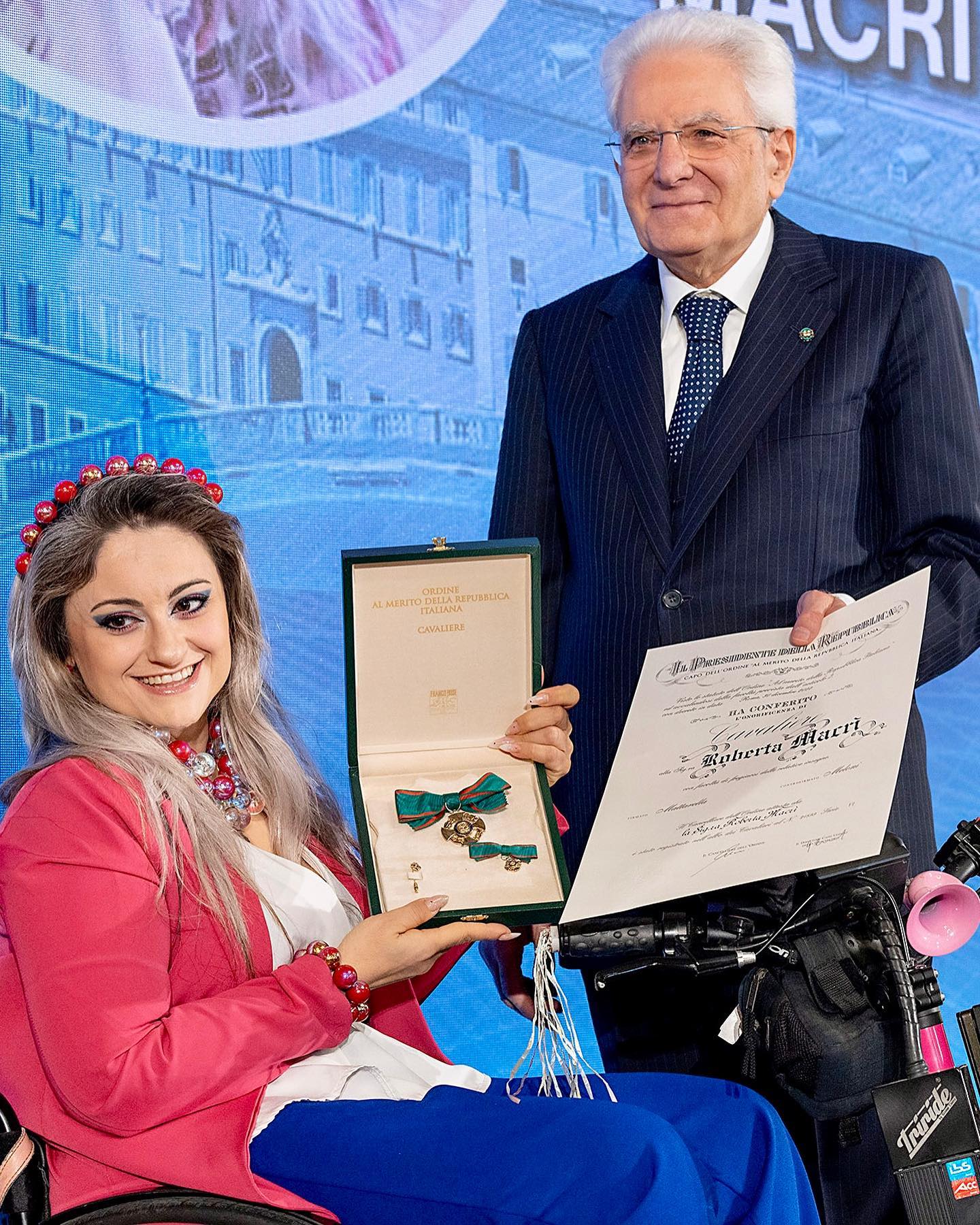 C'era anche lei tra coloro che al Quirinale hanno ricevuto l'onorificenza di Cavaliere al Merito della Repubblica Italiana. Un riconoscimento ambìto soprattutto per Roberta Macrì, 34 anni di Barcellona Pozzo di Gotto e da 2011 con una vita in carrozzina a causa di un incidente stradale che le ha fatto perdere l'uso delle gambe. Non per questo però Roberta ha rinunciato ai suoi sogni, come quello di avere un compagno, di continuare a danzare e poi di diventare una campionessa di Para Powerlifting.
