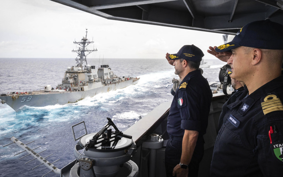 «La paura è normale quando osserviamo un sistema internazionale sempre più caratterizzato da crisi e conflitti, lo vediamo a casa nostra, l'abbiamo visto in Ucraina, quando non pensavamo mai che la guerra si potesse rimanifestare nel nostro Continente, eravamo tutti quanti convinti che fossero ricordi lontani. Guardiamo quello che sta succedendo in Medio Oriente, una continua recrudescenza di crisi ed è per questo che noi dobbiamo essere pronti a difendere i nostri spazi marittimi. Guardi, il fatto di essere già in mare, di poter intervenire in qualsiasi momento, di spostare navi da una zona all'altra del globo ai fini della sicurezza, è per noi della Marina Italiana uno dei ruoli principali. Ecco perché dobbiamo cercare di sfruttare ogni occasione utile con le marine alleate per metterci insieme e fare quello che le forze armate sono chiamate a fare, cioè difendere sempre gli interessi nazionali. Lo abbiamo sempre fatto, addestramento, training militare, la presenza di una nave e di un Carrier Strike Group, che è la massima espressione di capacità militare che la Marina può esprimere, esercita un'azione di rassicurazione e insieme di deterrenza perché dimostriamo di poter portare ovunque sia necessario una capacità militare molto spinta e avanzata».
