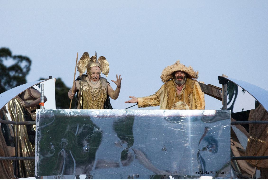 Il “pastiche” di Salvo trova rispondenza nella mescolanza di vernacoli che in Aristofane è diktat da sempre (toscano, romano, napoletano, siciliano, lombardo, pugliese) e non è da meno la furba, svelta traduzione di Nicola Cadoni, generosa di “calembour” moderni e “piacioni”: la fantozziana “Merdaccia Merdaccia” (nome e cognome di Trigeo, del padre, del nonno, come la famiglia Bobby Watson della “Cantatrice calva” di Ionesco), “reception”, “porchetta di Ariccia, no, di Ortigia”, “Porto Cervo Volante”, “uccellacci e uccellini”, e, sopra tutti, la didascalica strizzatina d’occhio di “Vladimir Cleone”. Dal canto suo, la musica di Patrizio Maria D’Artista è cornucopia di stili, repertori, citazioni (l’ultima, dichiarata, è il brindisi di “Traviata”) con echi di soundtrack disneyani, “Notre Dame” di Cocciante, canti dell’Est europeo fino alla (rin)corsa finale decisamente “Underground” alla Goran Bregovic. Naturalmente, a render giustizia di ciò, in opulenti assieme anche danzati (Miki Matsuse) è il Coro, magnificamente governato da Simonetta Cartia (corifea) ed Elena Polic Greco, corifea e intensa “voce” del monologo di Pace, muto simulacro in carne ed ossa (Jacqueline Bulnès).