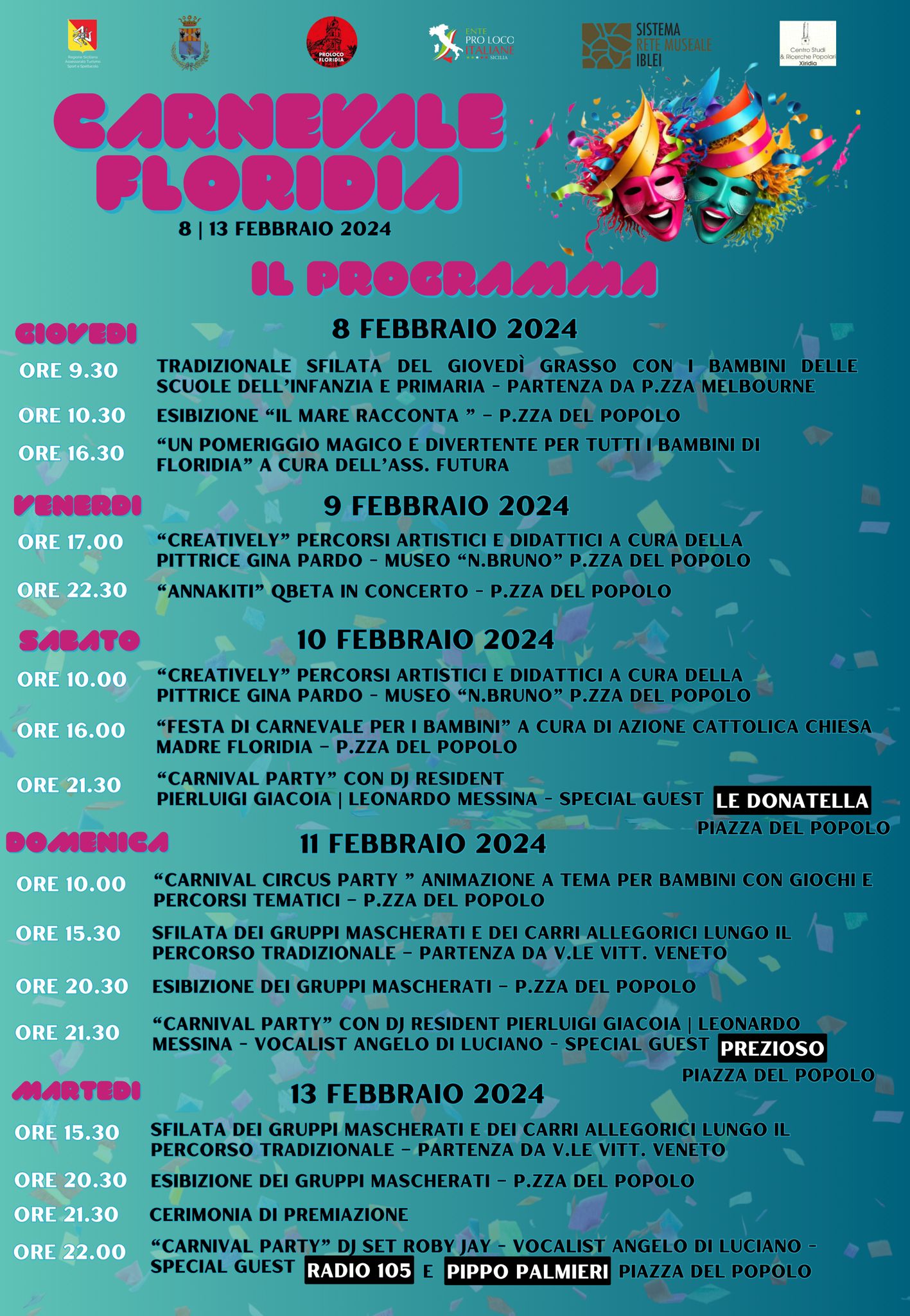 L’apertura è fissata per Giovedì Grasso, 8 febbraio, con la tradizionale sfilata che coinvolgerà buona parte del centro della città e i tanti piccoli delle scuole. Si parte in corteo da piazza Melbourne, per poi arriva, tra musiche e balli, in piazza del Popolo. Le attività per i più piccoli continueranno alle 16 con “Un pomeriggio magico e divertente per tutti i bambini di Floridia” a cura dell’associazione Futura.