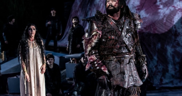 C’è aria di arie, in questo “Aiace” e non solo perché il talento proteiforme di Micheletti, attore, regista ed accreditatissimo baritono di teatro d’opera, impone, seppure con devozione al rito, una cifra legata, a suo modo, al melodramma. La ragione è che sul theologhéion, quell’ensemble musicale, discretissimo e strepitoso (violoncelli, percussioni, arpa, trombone, clarinetto, suonato, quest’ultimo, da un “musicattore” dentro all’inferno di sangue) è segno e sogno di un ruolo integrato ed integrante. Non è un mistero, del resto, che il talento creativo di Giovanni Sollima uno e due – interprete mirabolante e fecondo compositore, hic et nunc autore delle musiche – parli anche la lingua del “téatron” che si predica di appropriati interventi coreografici, classico e tribale insieme, di Fabrizio Angelini. La partitura, infatti, è l’altra “parola” di “Aiace”: loop e “canto parlato”, musicalissimi sussurri e grida di strumenti in dialogo, voce narrante riconosciuta al violoncello, comprensibilmente strumento “eletto”. Monodia e polifonia rappresentando, quest’ultima, l’unico tonante, suadente momento di ubriacante coralità. Di Coro in coro non se parla da un bel po’ nelle moderne tragedie in teatri di pietra: frammentare il testo del Coro facendo, così, di ogni elemento un corifeo solista, una sorta di coro shakespeariano, se si vuole, diventa scelta affrontabile per il metteur-en-scène che scende a compromessi con la classicità trasformando la tragedia in dramma borghese.