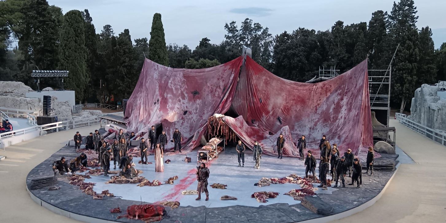 E per l’eroe mai fallito né per errore né per ingenuità, l’eroe senza macchia che pretende, a buon diritto, le armi di Achille, ce ne sono eccome di macchie di sangue che imbrattano, impregnano, quasi una sorta di liquido amniotico nella scena di Nicolas Bovey per “Aiace” di Sofocle che ha inaugurato la stagione dell’Inda al Teatro antico di Siracusa.
