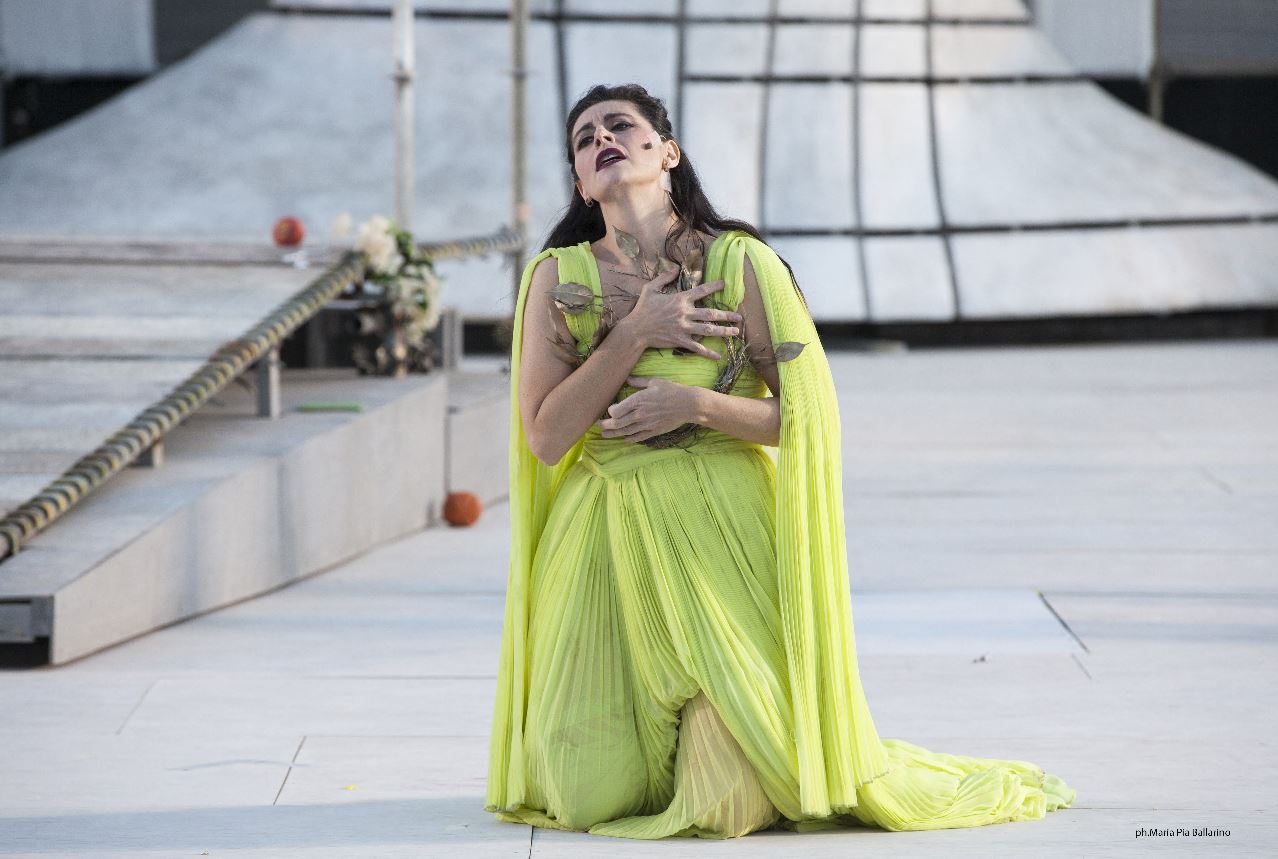 E lo fanno un sospiro dopo che Afrodite (gonna in tulle con coulisse, elmo ed armatura dorata nei costumi di Gary McCann anche scenografo), in discesa dalla cavea, guadagni la scena vestita solo di tubi Innocenti e ballatoi come da teatro smantellato e, al centro, da una struttura finora celata che non ci metterà molto a disvelarsi volto gigantesco di Fedra che diverrà sismografo di mozioni, emozioni, delitti, lutti, ritorni, spartenze. Dapprima “rigato” da pericolose fenditure che ne minacciano la rovina, quel volto sarà vistosamente porpora come da grumi di sangue, scosso da fiamme in proiezione fino a svuotarsi completamente i bulbi oculari (video design di Leandro Summo).