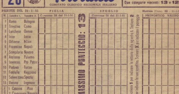 Il 13 arrivò sulla schedina con la prima giornata del girone di ritorno del campionato 1950-1951 (21 gennaio) e a vincere, quindi, tredici e dodici nello stesso tempo.