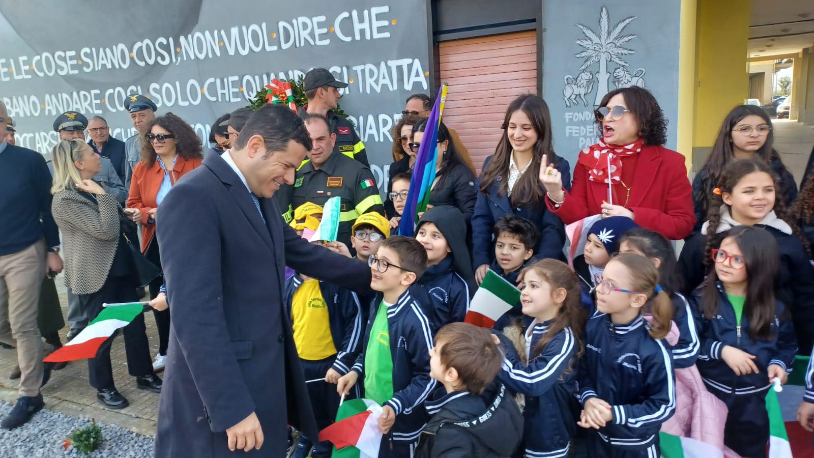Qui campeggiano i volti sorridenti di Giovanni Falcone e Paolo Borsellino. Oltre a Galvagno, era presente il sindaco di Maletto, Giuseppe Capizzi, e l’intera giunta comunale, oltre alle forze dell’ordine e alcune scolaresche locali.