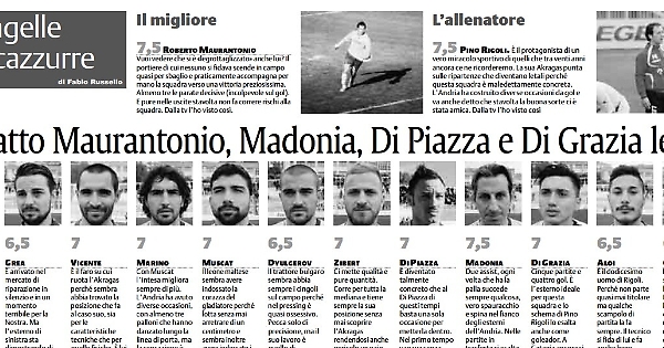 7,5 ROBERTO MAURANTONIO (il migliore) Vuoi vedere che si è «legrottaglizzato» anche lui? Il portiere di cui nessuno si fidava scende in campo quasi per sbaglio e praticamente accompagna per mano la squadra verso una vittoria preziosissima. Almeno tre le parate decisive (incolpevole sul gol). E pure nelle uscite stavolta non fa correre rischi alla squadra. Dalla tv l’ho visto così.