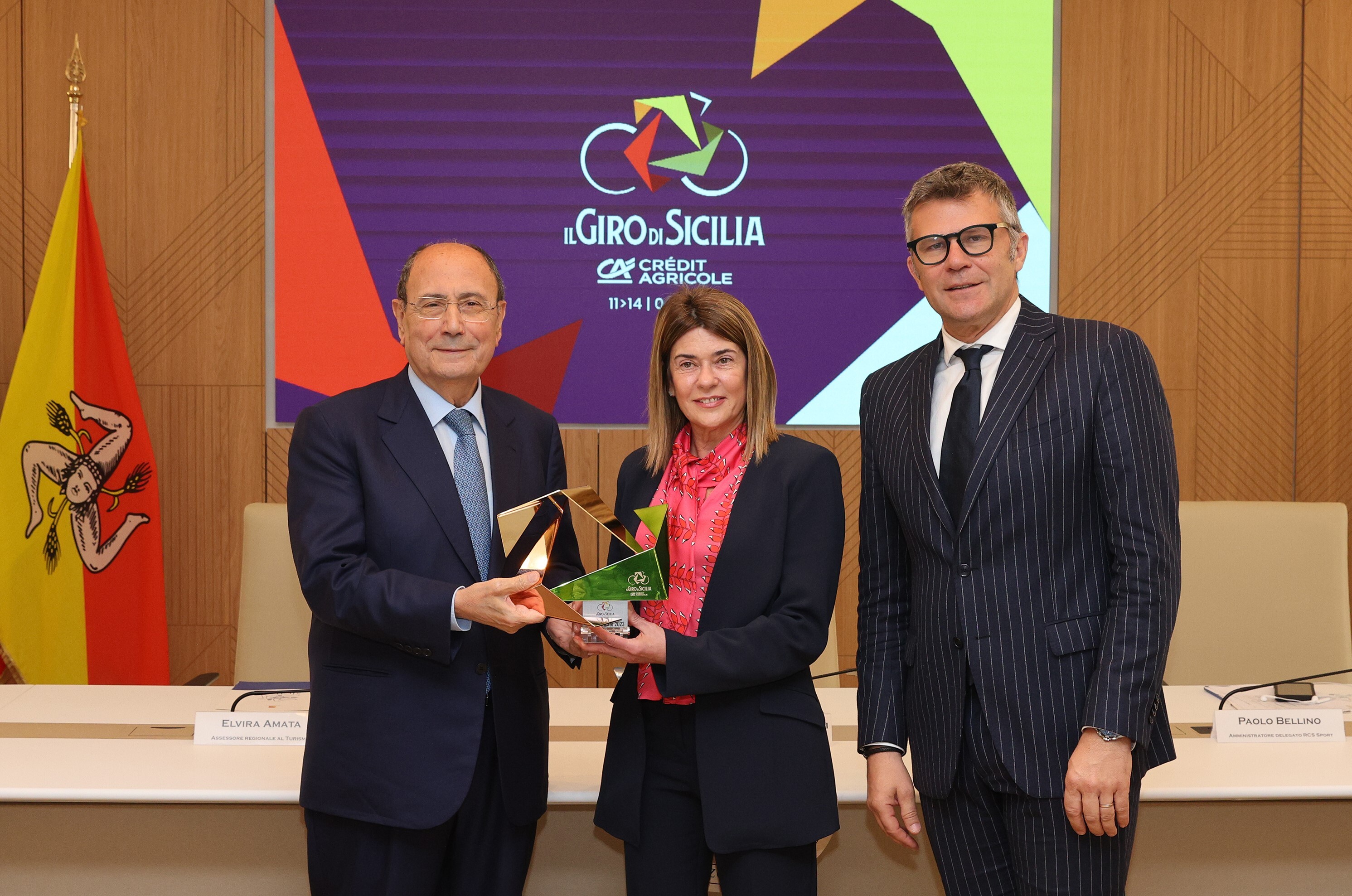 Renato Schifani, Presidente della Regione Siciliana ed Elvira Amata, assessore Regionale Turismo e Sport, con il Trofeo de Il Giro di Sicilia insieme a Paolo Bellino, Amministratore Delegato di Rcs Sport