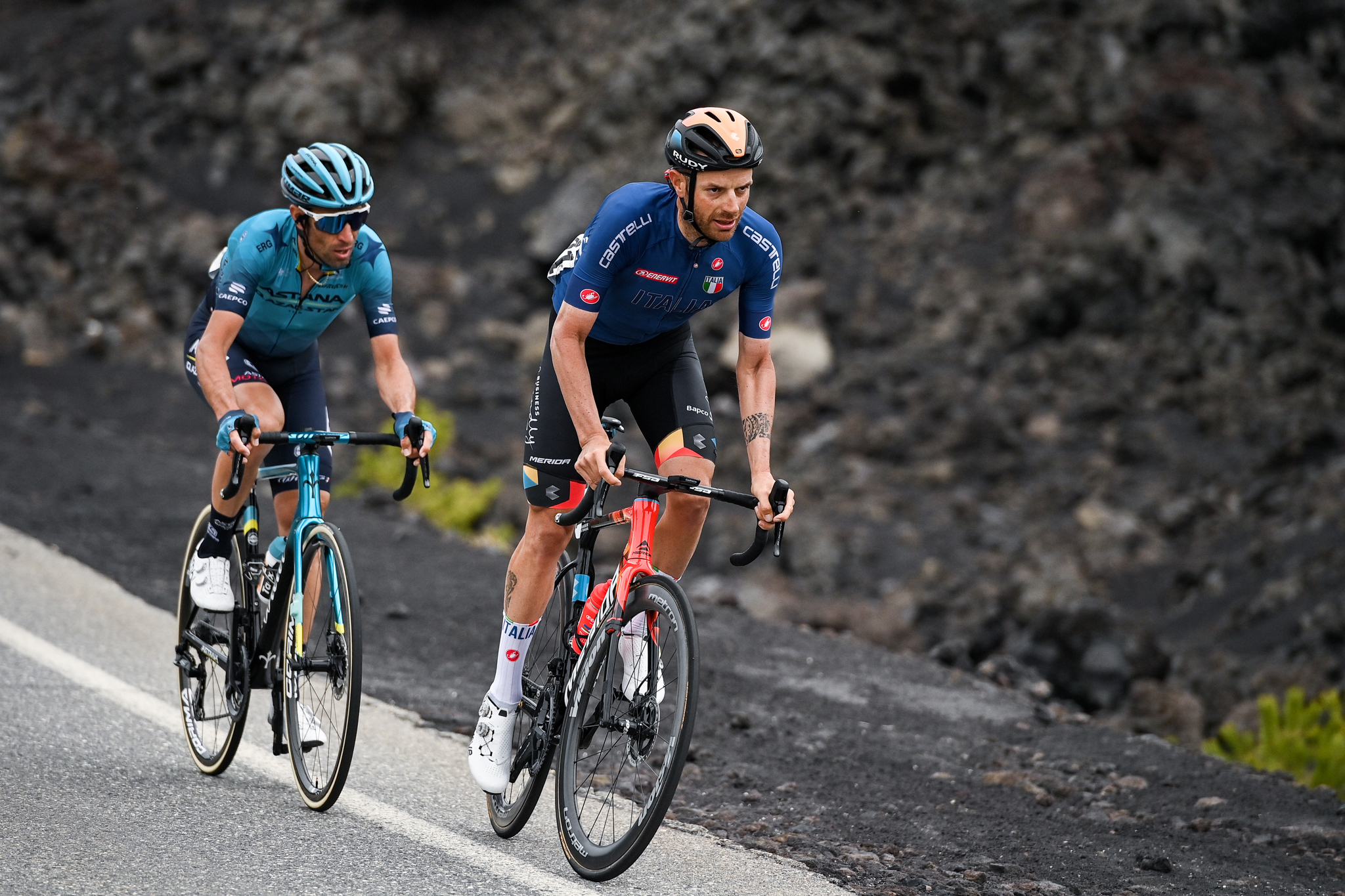 Vincenzo Nibali e Damiano Caruso sui tornanti dell'Etna nel Giro di Sicilia 2022