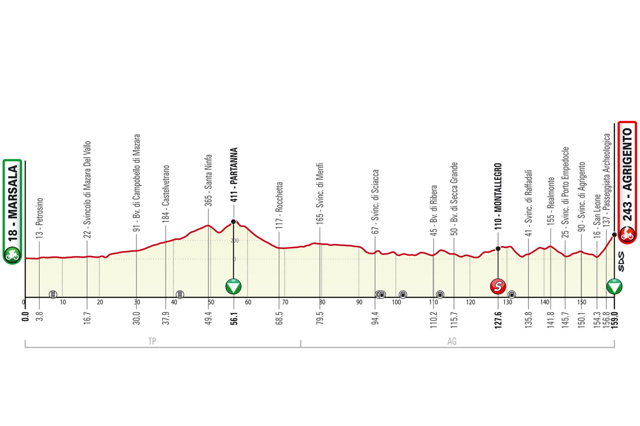 1ª TAPPA: MARSALA-AGRIGENTO. Martedì si comincia con la prima tappa da Marsala alla Valle dei Templi di Agrigento di 159 km, pronta a regalare le prime emozioni. Sarà una tappa divisa in due parti. La prima parte piuttosto articolata in saliscendi e numerose curve nell’entroterra trapanese e nella Valle del Belice. Seconda parte quasi interamente su strade a scorrimento veloce e senza veri attraversamenti di centri urbani. Lasciata Marsala si procede infatti per saliscendi attraverso Castelvetrano, Santa Ninfa e Partanna fino a entrare nella strada a scorrimento veloce che, lungo la costa e con alcuni saliscendi con pendenze moderate, porta a 4 km dall’arrivo all’ingresso della Valle dei Templi ai piedi di Agrigento. Gli ultimi chilometri sranno tutti in salita attorno al 5% con un breve tratto attorno al 9% a 2.5 km