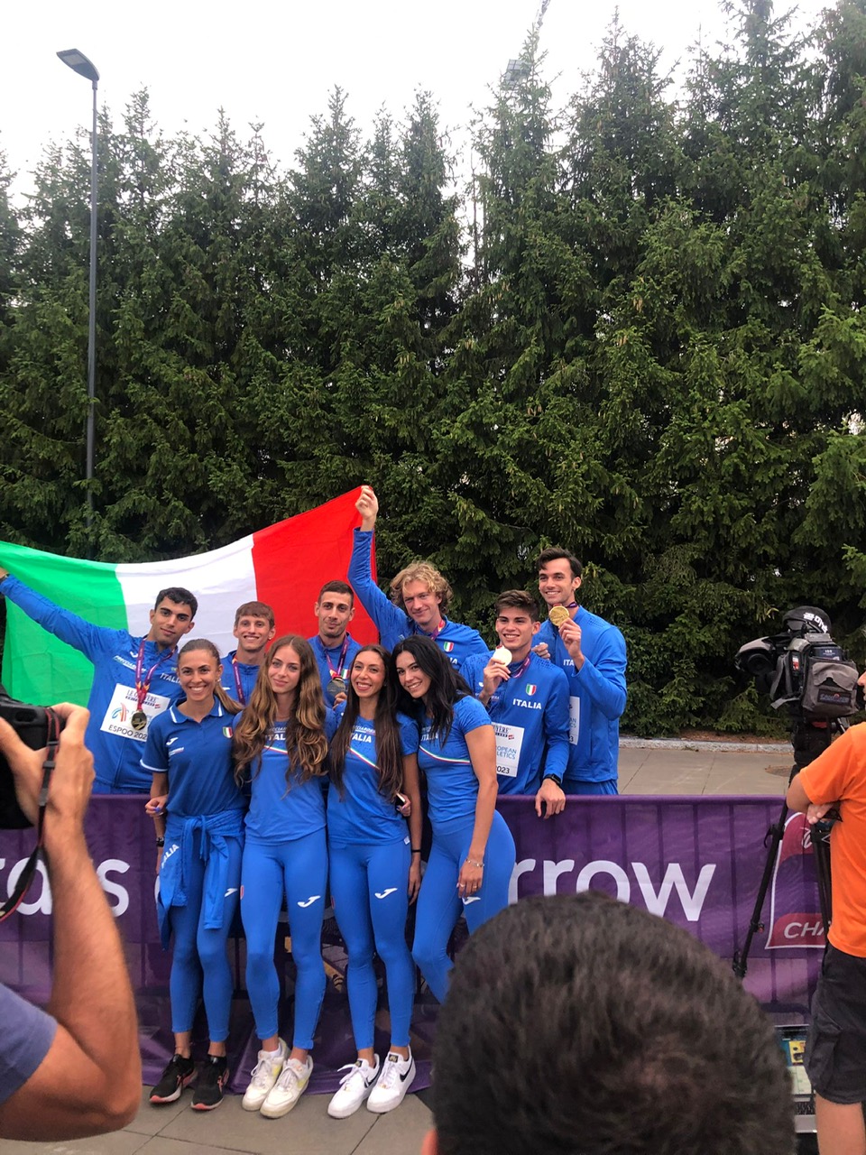 Matteo Melluzzo (Fiamme Gialle), allenato dal papà Gianni ha cancellato in fretta la delusione per l’esclusione dalla finale dei 100 (7° in semifinale in 10”36 dopo aver vinto la batteria n 10”38) e ha dato un grande contributo al successo del quartetto azzurro affiancando Eric Marek, Marco Ricci e Junior Tardioli per arrivare all’oro in 38”92 (tre millesimi di vantaggio sulla Francia) migliore prestazione nazionale di categoria che cancella il 39”05 di Tumi, Basciani, Obou e Manenti, medaglia d’oro a Ostrava nel 2011.