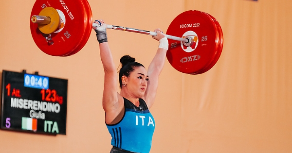 Giulia Miserendino, classe 2002, allieva del ct Stefano Corbu al Gs Fiamme Oro, ha vinto l’oro nello strappo sollevando 107 kg alla terza prova. Dopo due prove nulle nello slancio solleva 123 kg e vince il secondo titolo e completa la sua grande giornata con l’oro nel totale con 230 kg.