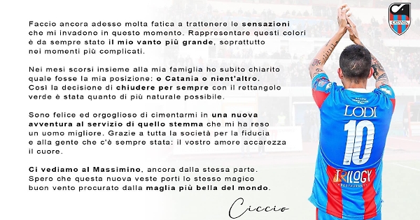 Ciccio Lodi resta al Catania ma da dirigente. E’ stato il vicepresidente Grella ad annunciare l’ingresso dello storico capitano nello staff dirigenziale. Lodi aveva deciso di ritirarsi dopo la promozione in Serie C, ma l’amore per i colori rossazzurri non è mai finito: “Faccio molto fatica a trattenere le sensazioni che mi invadono in questo momento – è il messaggio ai tifosi prima della presentazione a fianco di Vincenzo Grella -, rappresentare questi colori è da sempre il mio vanto più grande. Nei mesi scorsi con la mia famiglia ho subito chiarito la mia posizione: o Catania o nient’altro. Così la decisione di chiudere con il campo è stata naturale. Ora sono felice e orgoglioso di cimentarmi con questa nuova avventura al servizio dello stemma che mi ha reso un uomo migliore. Grazie alla società per la fiducia e alla gente che c’è sempre stata: il vostro amore accarezza il cuore. Ci vediamo al Massimino”.