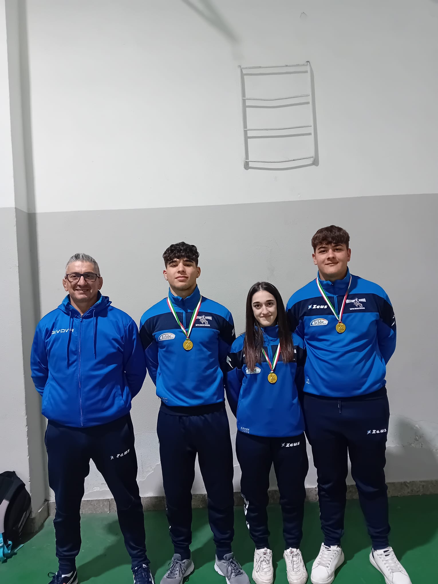Il maestro Gianluca Caniglia con i tre campioni d'Italia della Wrestling Scordia: Alessandro Berlich, Maria Antonietta Caldiero e Gabriele Vitale