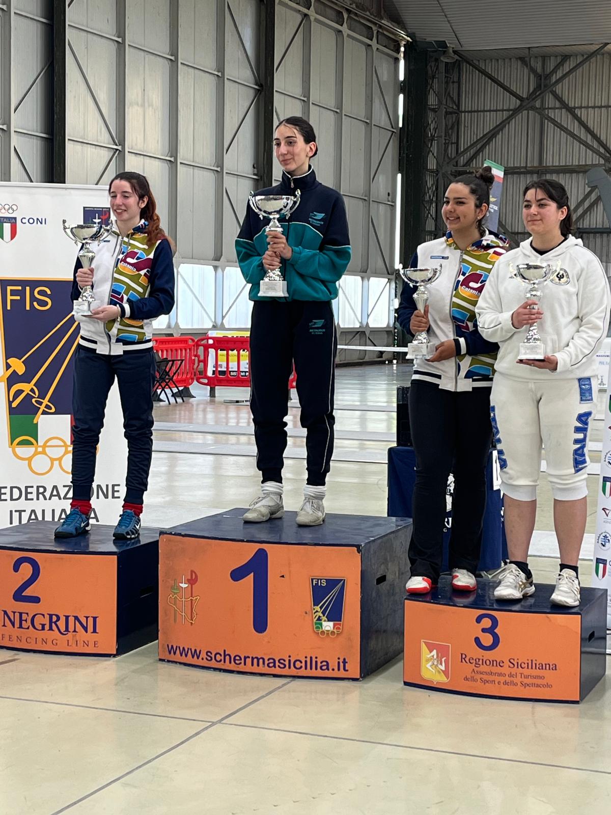 Giovani. Spada f.: 1) Beatrice Luca (Methodos Battiati); 2) Giulia Platania (Cus Ct); 3) Sofia Leotta (Cus Ct) e Barbara Giuliano (Catania Fencing Club); 5) Livia Liuzzo (Circolo della S. Jonica).