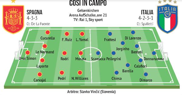Spagna-Italia: quella che attende stasera sera a Gelsenchirken Donnarumma e compagni, è una partita in cui il commissario tecnico Luciano Spalletti vuol far vedere di che pasta è fatta la sua squadra, che punta contro le Furie Rosse a scoprire la sua vera identità, dopo l’incoraggiante avvio con la vittoria contro l’Albania. «Voglio vedere - ha detto ieri il ct azzurro nella conferenza stampa della vigilia nella pancia dello stadio dello Schalke 04 - un’Italia che ripeta la buona prestazione della prima partita: davanti avremo la Spagna, una delle migliori scuole calcistiche al mondo, ma noi abbiamo una voglia matta di far vedere che anche la nostra squadra è importante. La chiave - ha spiegato il ct - è sempre il bel gioco e tenere la palla. Anche se con la Spagna che pressa e tiene la linea difensiva alta, qualche verticalizzazione in più ci sta. Si vince verticalizzando il gioco».